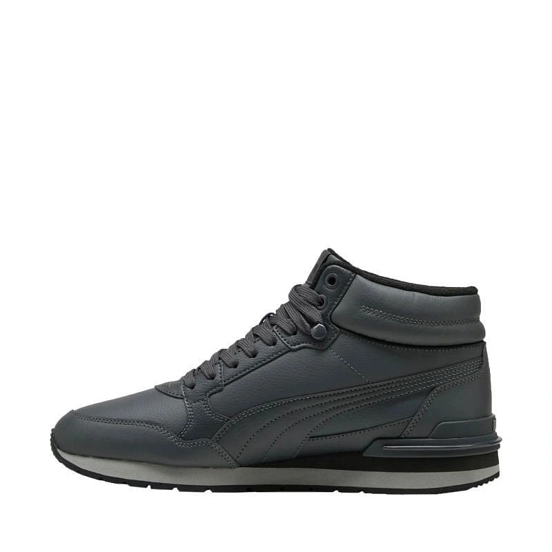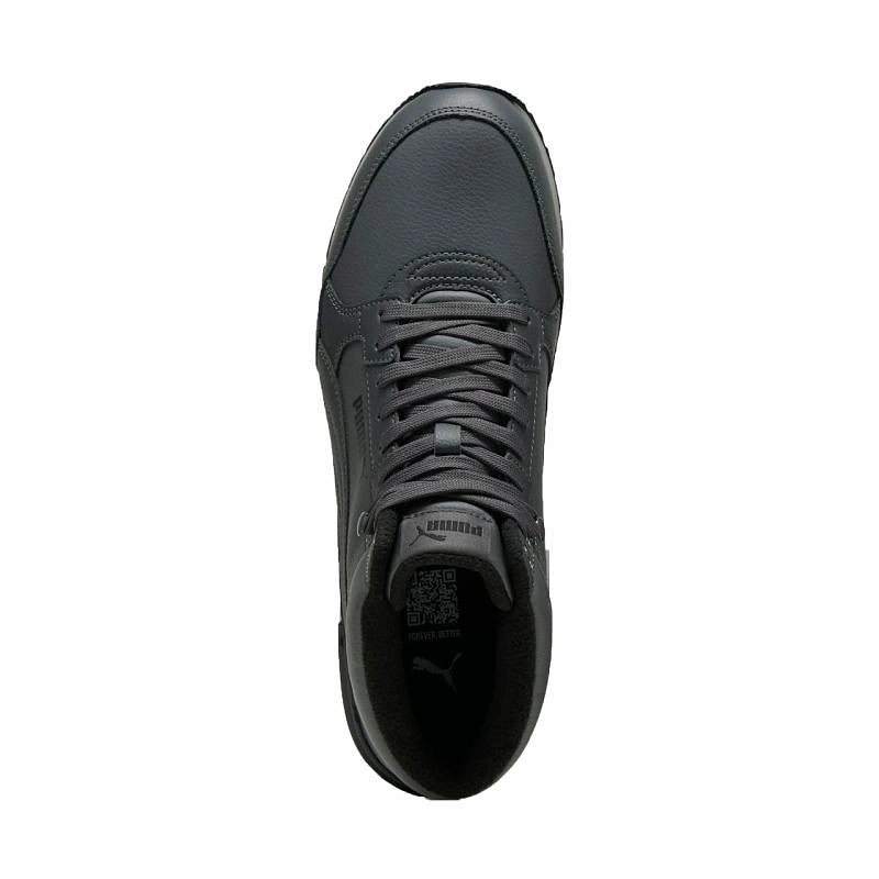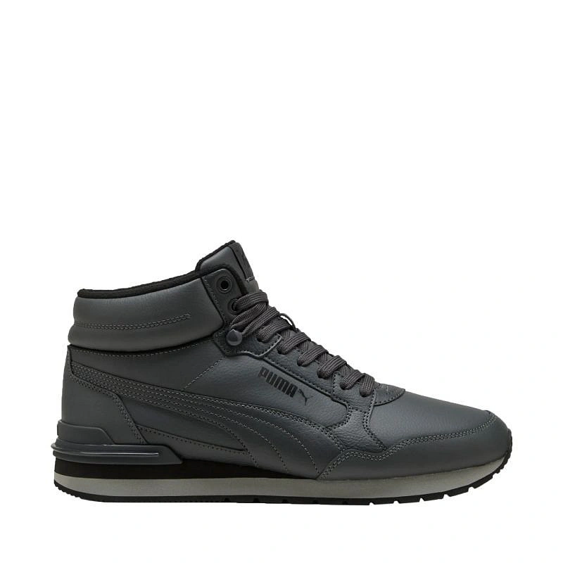 Boty Puma ST Runner v4 Mid grey 402893 03 Puma jsou ideální pro přechodné a zimní nošení. Svršek z ekokůže. Tradiční šněrování se zapínáním na suchý zip. Středně vysoký profil stabilizuje kotník. Textilní vnitřek s měkkou fleecovou podšívkou. Stélka SoftFoam+ s antimikrobiálními vlastnostmi kopíruje tvar chodidla. Odolná podrážka získává přilnavý dezén. Obuv vyrobena z nejméně 20 % z recyklovaných materiálů.
