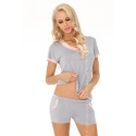 Elegantní, stříbrošedé dvoudílné pyžamo zdobené půvabným, světle růžovým lemem. Velmi ženské. Vyrobeno z mimořádně měkké, na dotek příjemné viskózy, která se tak hezky obléká (nejen) večer. Výstřih do V - atraktivně zdobí tělo. Okraje v drobných, čokoládových puntíčcích. Halenka s krátkými rukávy, ideální také jako domácí oblečení. Šortky s kapsami. Složení: 94 % viskóza, 6 % elastan.