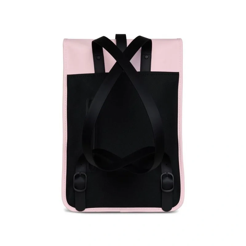 - Batoh Mini je vyroben z charakteristické voděodolné PU tkaniny Rains, která je navržena pro pevnost, odolnost a hladký omak.