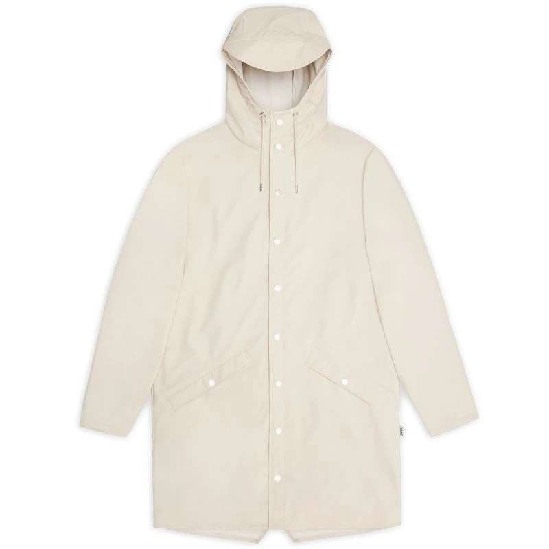 Ta kurtka przeciwdeszczowa to dłuższa wersja klasycznej kurtki Rains. Posiada zapięcie na zatrzaski, kaptur z wbudowaną czapeczką oraz dwie boczne kieszenie zapinane na zatrzaski. Rękawy zapinane są na zatrzaski, dzięki czemu można je regulować, dopasowując do sylwetki.