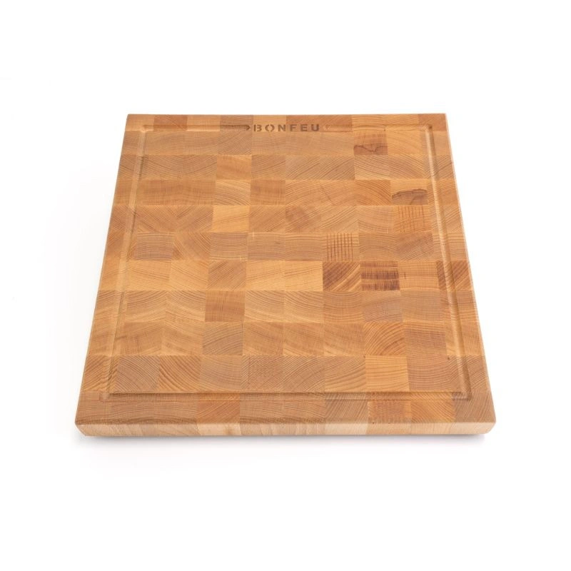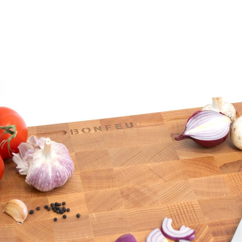 Krájecí prkénko BonButcher block od BonFeu je pevné a robustní prkénko vyrobené z příčně řezaného bukového dřeva. Díky této úpravě je pracovní plocha mimořádně odolná proti mechanickému poškození a intenzivnímu používání. Zároveň si prkénko při krájení zachovává přirozenou měkkost, takže nože zůstávají déle ostré. Přirozená struktura dřeva v kombinaci s elegantní povrchovou úpravou činí prkénko ideálním pro přípravu i servírování pokrmů na zahradě nebo v kuchyni. Výrobek byl dvakrát naolejován, díky čemuž je lépe chráněn proti vlhkosti a snadno se udržuje.
