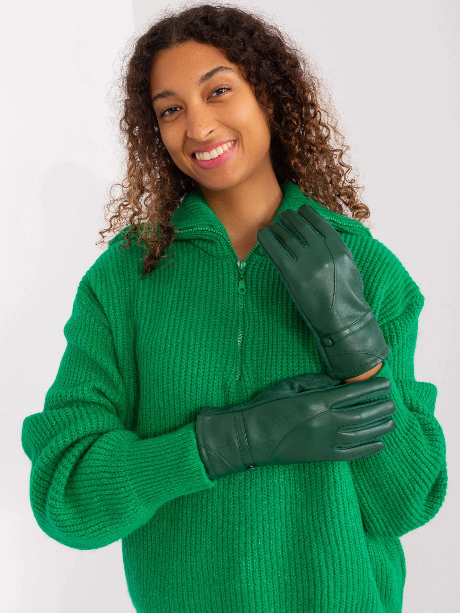 Tmavě zelené koženkové rukavice.