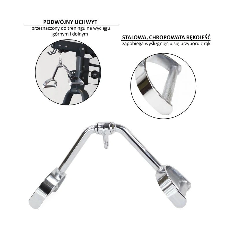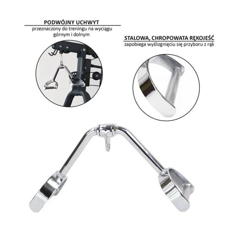Konstrukce rukojeti zaručuje ideální polohu rukou a vynucuje si správný pohyb při cvičení. Široký rozestup rukojeti umožňuje cvičit pod alternativním úhlem k úzké rukojeti, což dává možnost efektivnějšího tréninku a plného rozvoje svalové skupiny. Je vyrobena z vysoce kvalitní oceli.