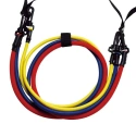 FITNESS GUMS SET obsahuje: 3 barevné odnímatelné gumy: červenou (2,5 kg), modrou (1,5 kg) a žlutou (1 kg). Délka gum: 114,3 cm. Odpor lze nastavit pomocí jednoduchého systému odnímatelných gum.