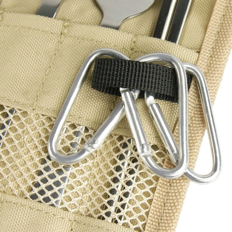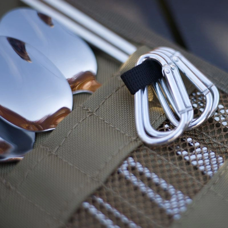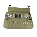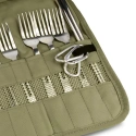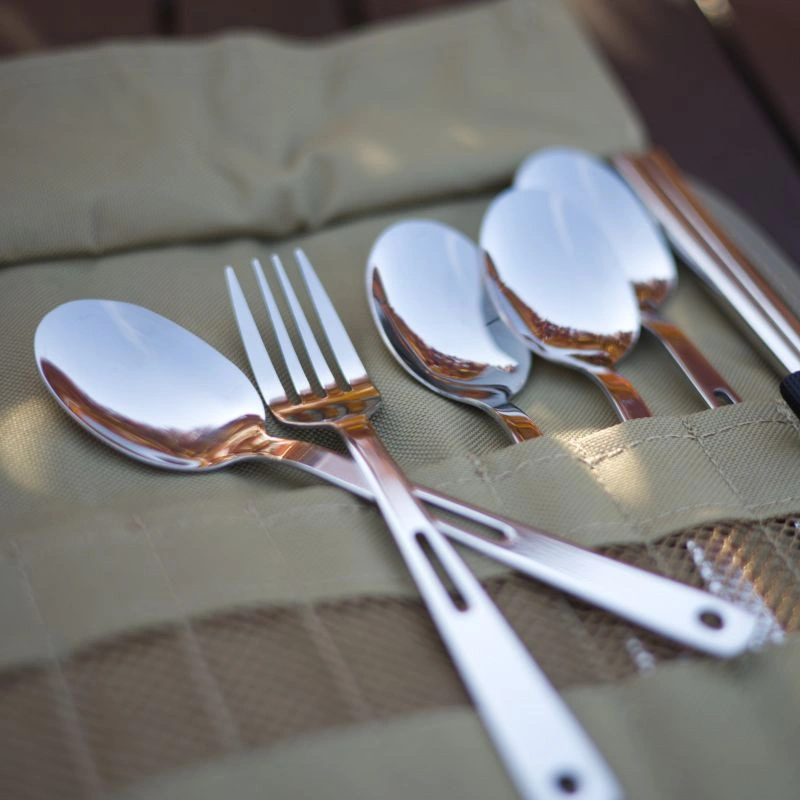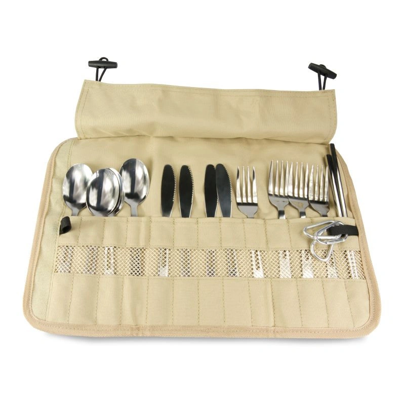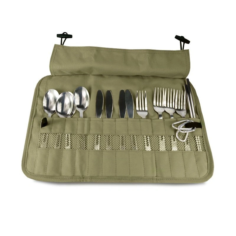 Sada obsahuje: 4 lžíce, 4 vidličky, 4 nože, sadu jídelních hůlek, 3 karabinky