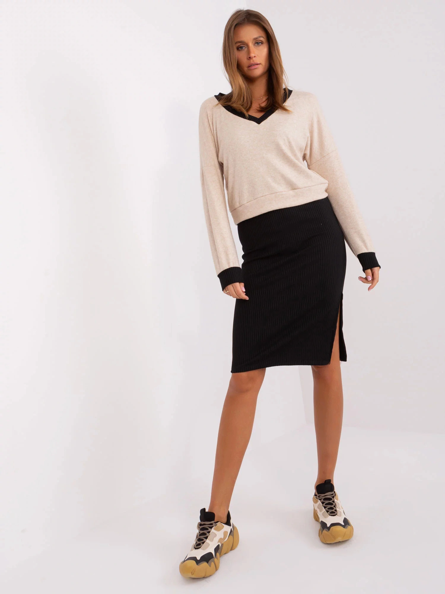 Béžovo-černý pletený set - svetr a šaty od RUE PARIS.