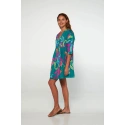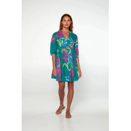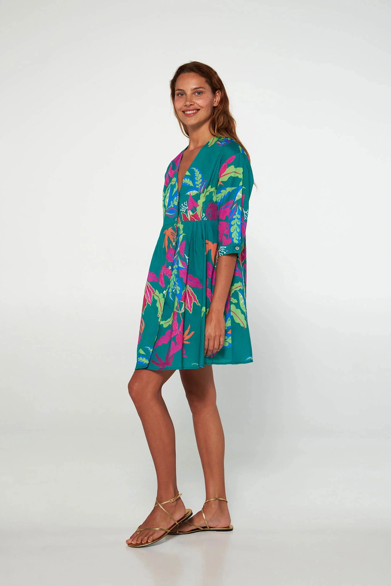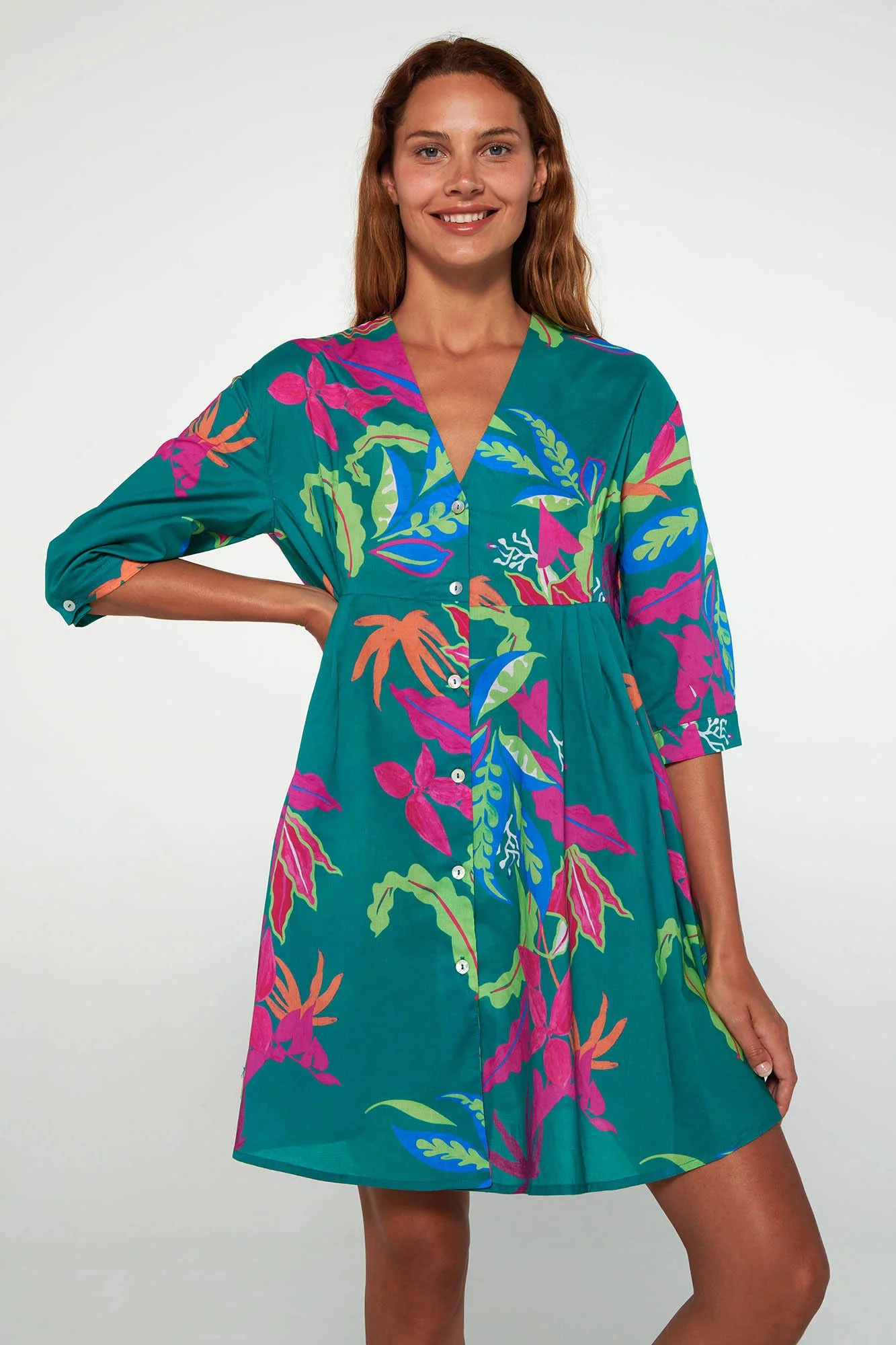 Šaty na knoflíky s krátkými rukávy a výstřihem do V, v uvolněném střihu. Vyberte si chladivé, bavlněné květinové šaty na teplá letní rána.