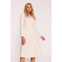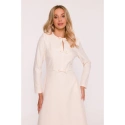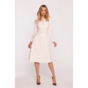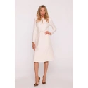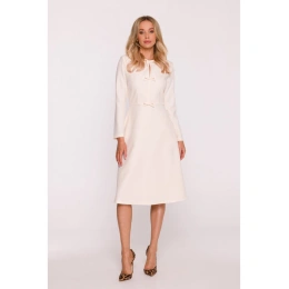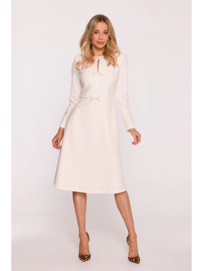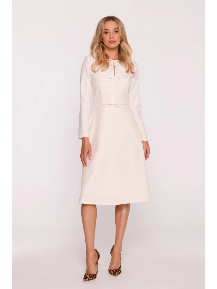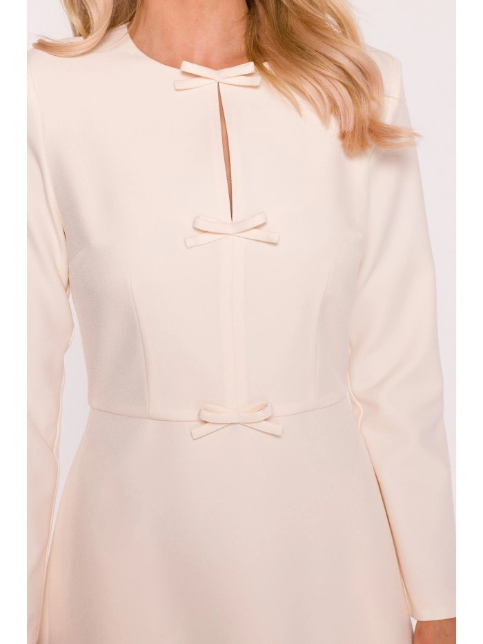 HLAVNÍ LÁTKA 97% polyester 3% elastan PODŠÍVKA 95% polyester 5% elastan Tkanina: hladká tkanina PODROBNOSTI O VÝROBKU Výstřih: kulatý u krku s rozparkem vpředu Rukávy: dlouhé Kapsy: žádné Zapínání: skrytý zip na zádech Podšívka: plně podšitá Model: S414 Navrženo a vyrobeno v Polsku Modelka měří 174 cm a nosí velikost S STYL A STŘIH Styl: trapézové šaty s ozdobnými mašlemi vpředu Tvar: uvolněná áčková linie, volnější v oblasti boků Délka: pod kolena