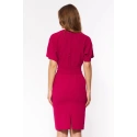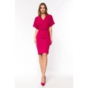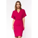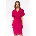Volně vypasované šaty končící nad koleny. Kimonový top s výstřihem do V a plisovaná tužková sukně převázaná páskem. Široké rukávy v délce k loktům. Zapínání na zip a větrací otvor na zádech. Háčkovaná látka, bez podšívky.