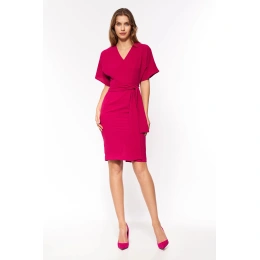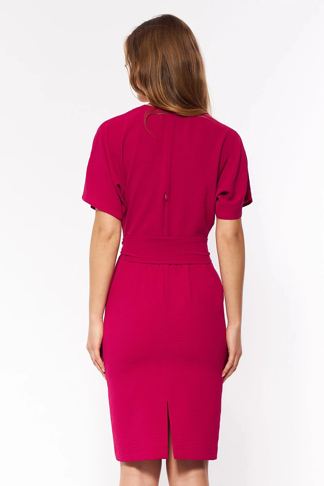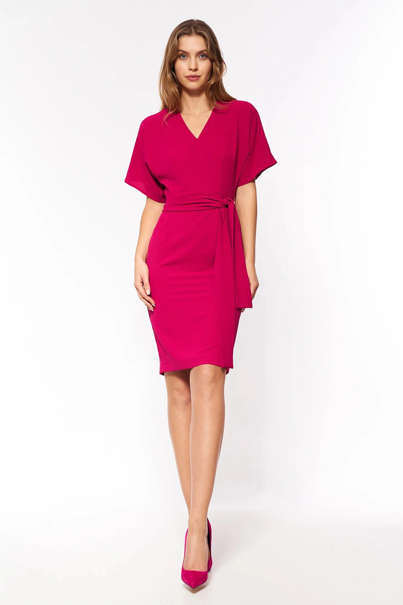 Volně vypasované šaty končící nad koleny. Kimonový top s výstřihem do V a plisovaná tužková sukně převázaná páskem. Široké rukávy v délce k loktům. Zapínání na zip a větrací otvor na zádech. Háčkovaná látka, bez podšívky.