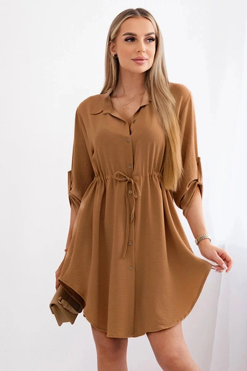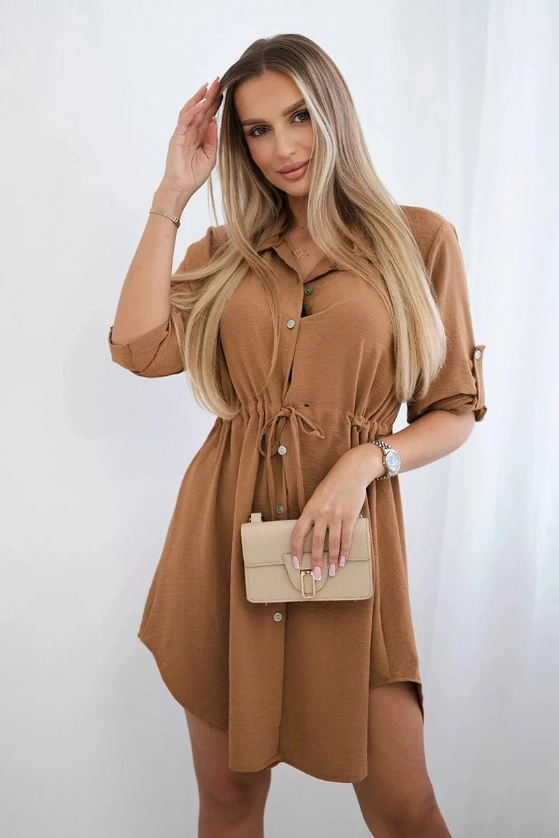 Šaty se zapínáním na knoflík, zavazováním v pase a límečkem jsou spojením elegance a jemného půvabu v jednom. Knoflíky dodávají šatům třídu a styl a zároveň umožňují snadné oblékání a svlékání. Zavazování v pase zdůrazňuje ženskou postavu, dodává jí individuální charakter a zajišťuje dokonalé padnutí. Límec dodává eleganci a sofistikovanost a dodává šatům jemný a jemný akcent. Je to ideální varianta pro různé příležitosti, od obchodních schůzek až po romantická rande, při zajištění pohodlí a módního vzhledu. Velikost je univerzální a bude vhodná pro ženy, které nosí velikost S, M nebo L.