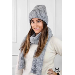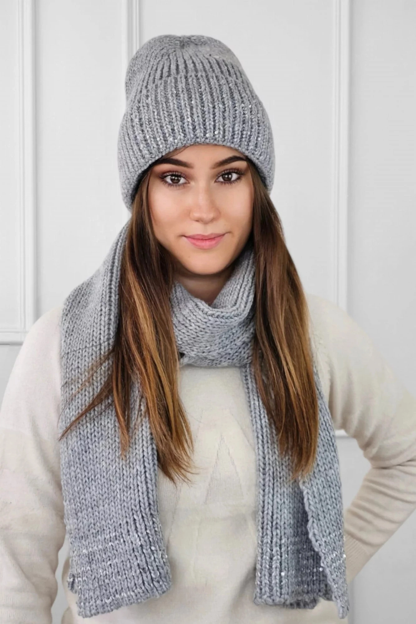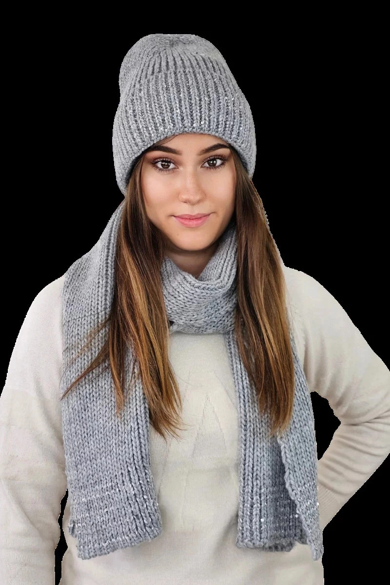 GINNY SET Fenomenální set sestávající z klobouku s širokým ohrnutím přes čelo a měkkého šátku. Vyrobeno z vysoce kvalitní příze s přídavkem vlny. Čepice i šála jsou zdobeny flitry. GINNY je souprava, která poskytne výjimečný tepelný komfort a bude zajímavým doplňkem každé podzimně-zimní stylizace.