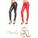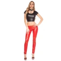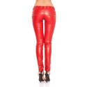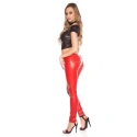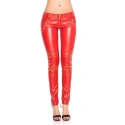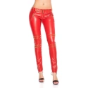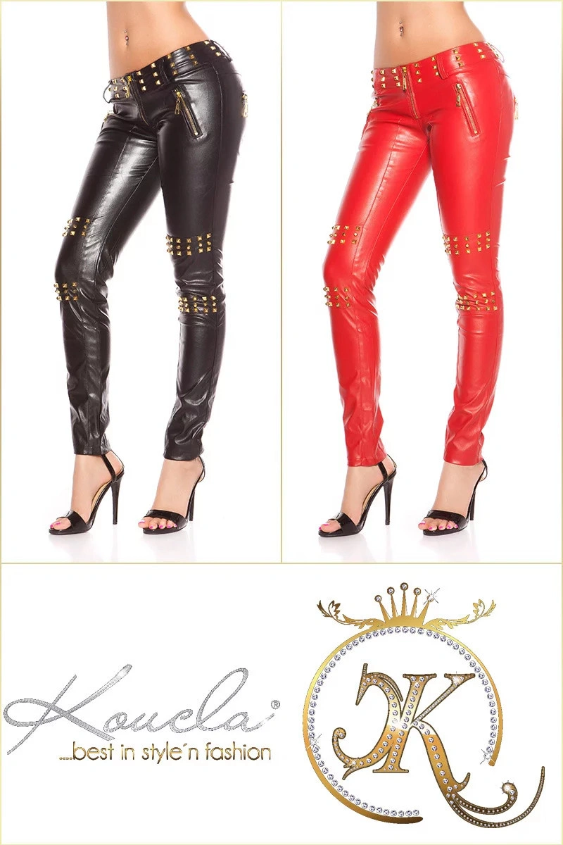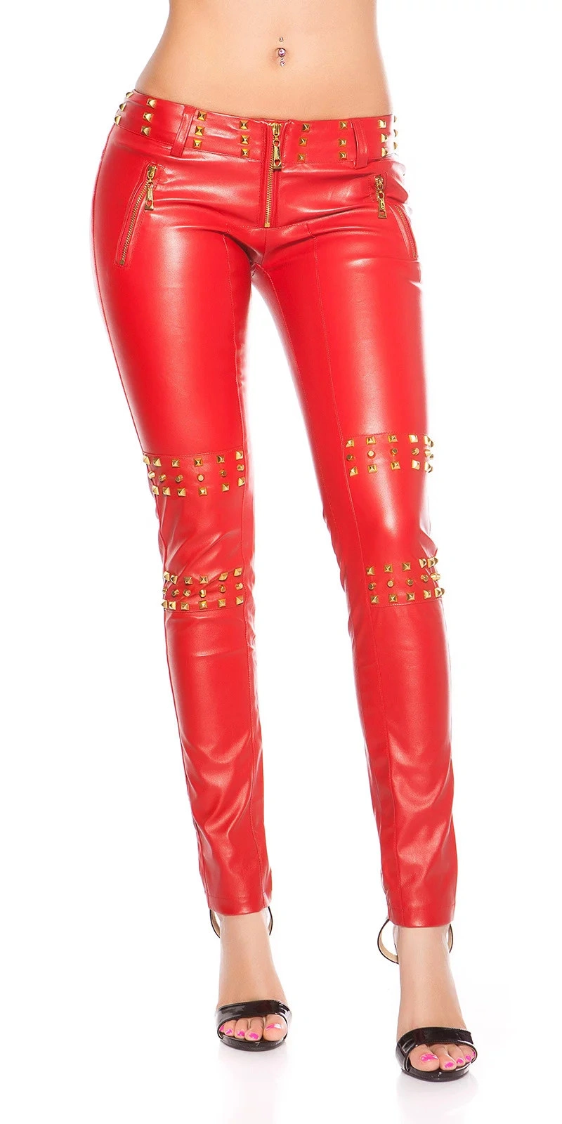 Dámské koženkové kalhoty s kapsami na zip a cvočkami kolem pasu.