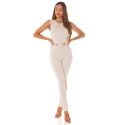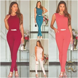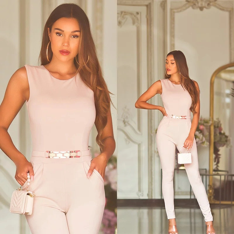 Dámský overal bez rukávů, s dlouhými kalhotami. Vepředu polopásek s pozlacenou sponou.   MateriálovéVíce