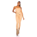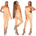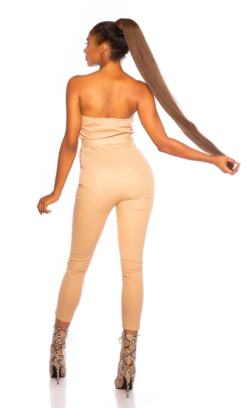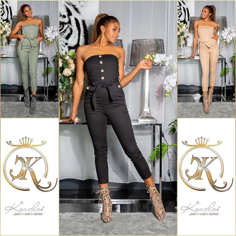 Dámský overal bez rukávů, s gumou na udržení, v pase na zavazování. Kalhoty 3/4 délky, vrchní díl s našitými knoflíky.