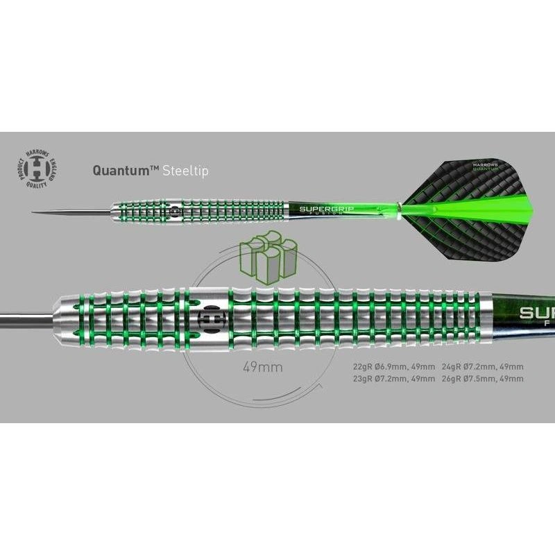 Šipky Quantum jsou komplexní kombinací přesného frézování, přebroušení a konkávního, živého kovového povlaku, který poskytuje jedinečnou konkávní, segmentovanou rukojeť, která hráčům poskytuje dokonale propracované, vícesměrné ovládání.