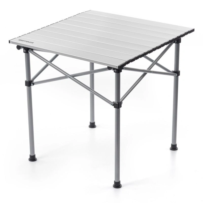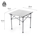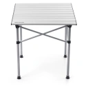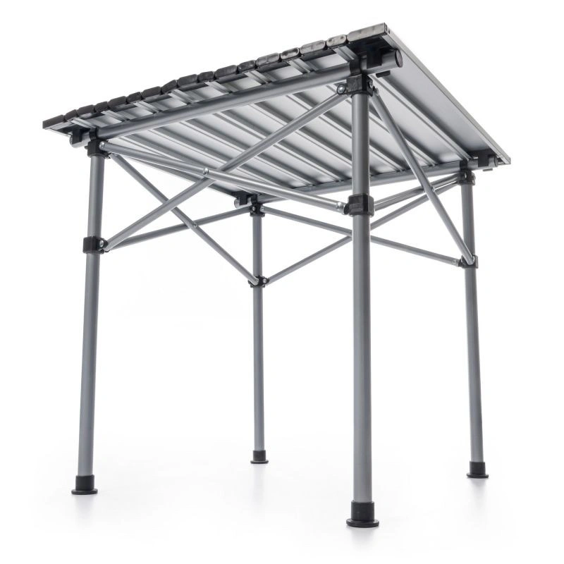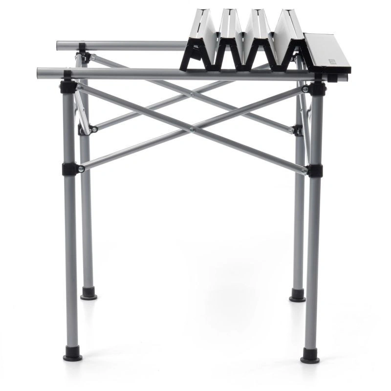 - Skládací deska, tvořená hliníkovými prkny spojenými pružnými pásky, se snadno montuje a demontuje, takže stůl je během chvilky připraven k použití.
