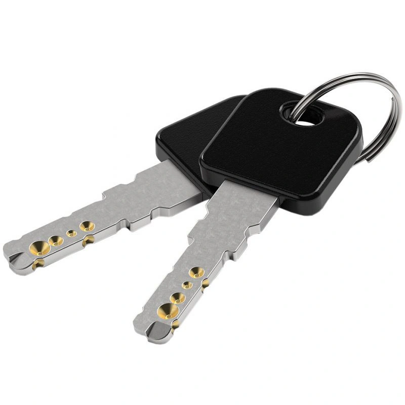 - sada obsahuje: zámek na kolo + 2 symetrické klíče - západkový zámek - i s vyjmutým klíčem.