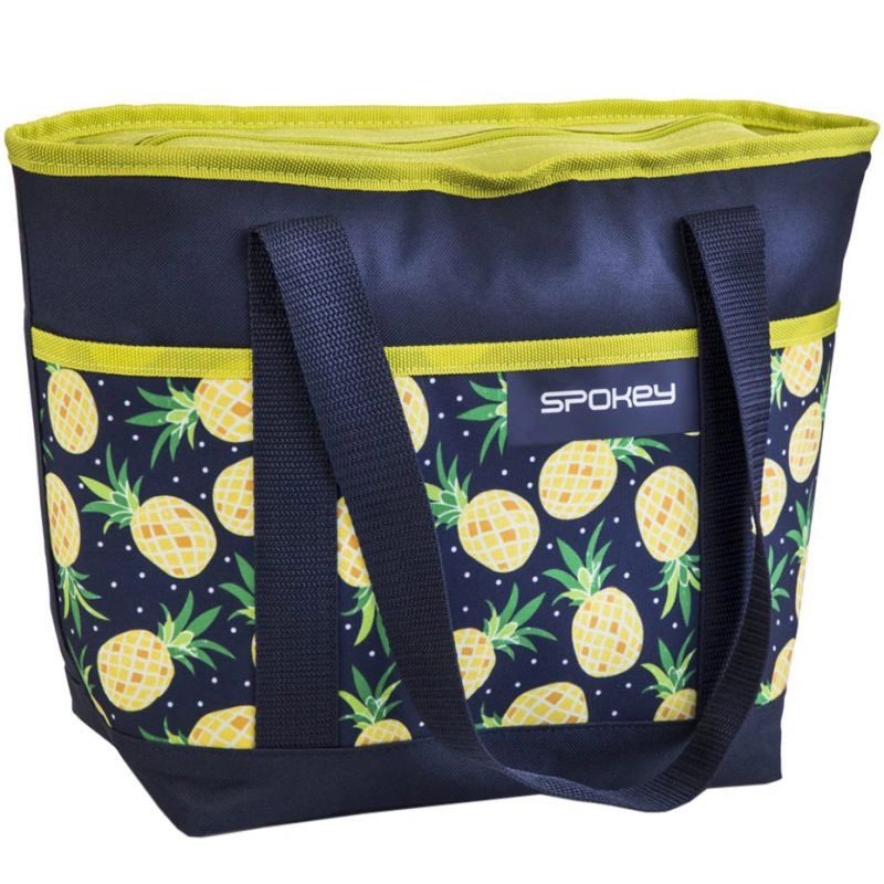 Termo taška Spokey San Remo ananas 929520 Termo taška Spokey bude nepostradatelná při výletech na pláž, rodinných výletech, piknicích. Model má prostornou hlavní přihrádku na zip vybavenou tepelnou izolací, která zabraňuje zahřívání obsahu. Vnitřní vrstva je vyrobena z hliníku. Další kapsa se zapínáním na suchý zip. Odolná ucha usnadňují přenášení. Taška je vyrobena z polyesteru 600D vyztuženého PE pěnou, což se promítá do kvality a odolnosti. Technické údaje: - materiál: polyester 600D, PE pěna, hliníková fólie - rozměry: 52 x 20 x 40 cm - objem: cca 21 l - maximální hmotnost vybavení: 15 kg.