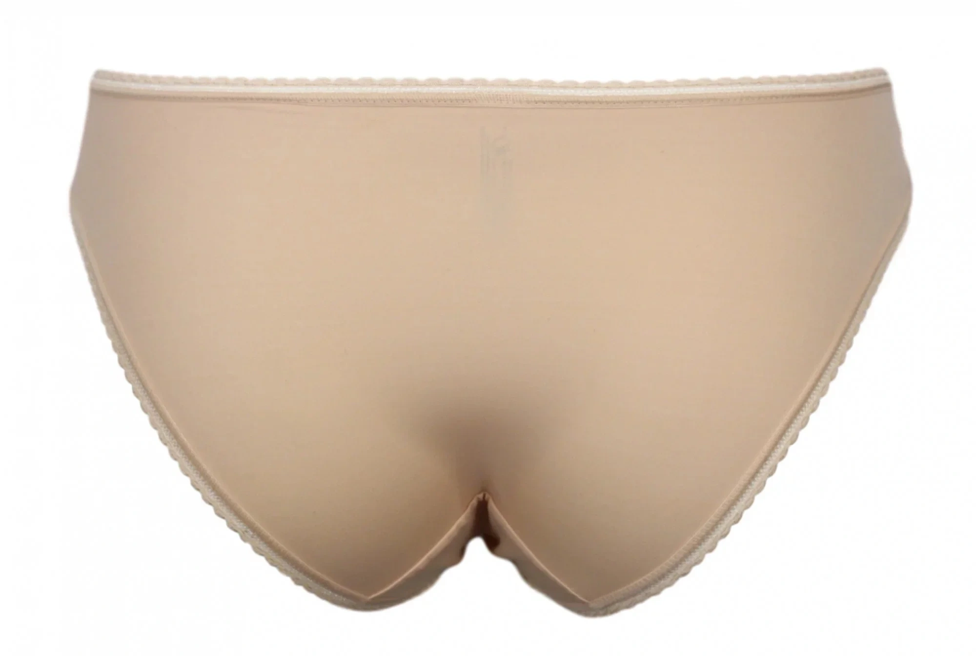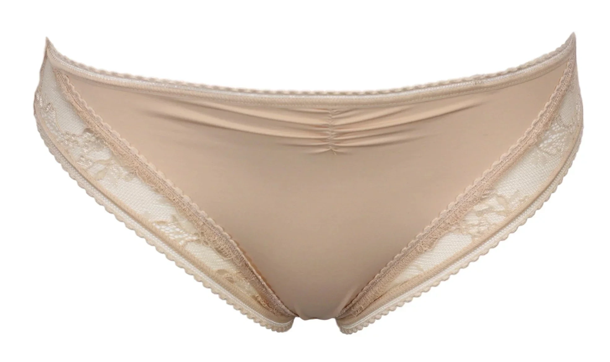 Krásné béžové kalhotky z mikrovlákna s krajkovými vsadkami. Hladká přední i zadní strana. Malé krajk