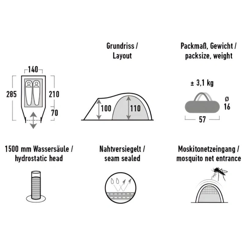 - high Peak 2místný kopulový stan s předsíňkou ideální pro krátký kempink, festival, krátkou túru.