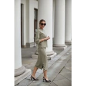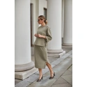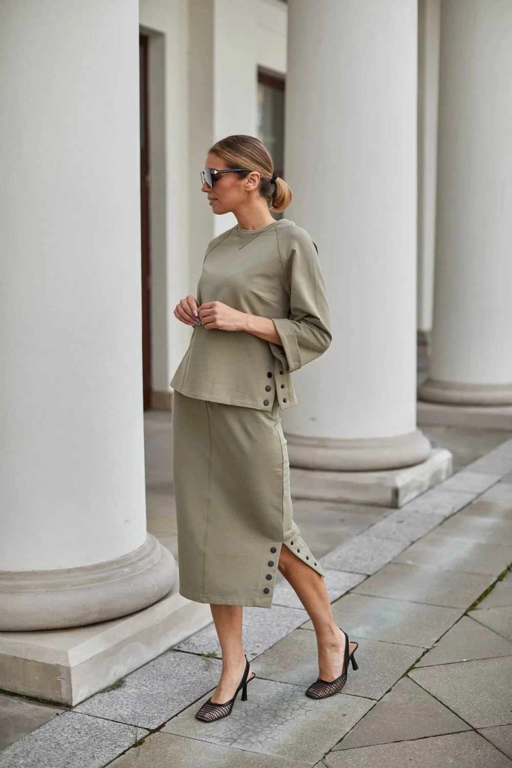 Tato dvoudílná dámská souprava si získala srdce našich zákazníků. Je vyrobena z měkkého úpletu. Horní díl má krabicový tvar s širšími, nařasenými rukávy. Mírně vypasovaná sukně ve 3/4 délce dodává módní charakter. Široký elastický pas umožňuje, aby sukně dokonale přilnula k tělu. Zdobí je velké kovové knoflíky na horní části a na sukni. Na atraktivitě přidává také ozdobné prošívání v podobě rámečku podél sukně a na spojení rukávu a blůzy. Tento promyšlený střih nabízí pohodlí ženám všech velikostí. Bez podšívky..