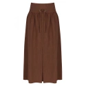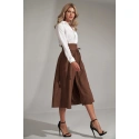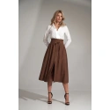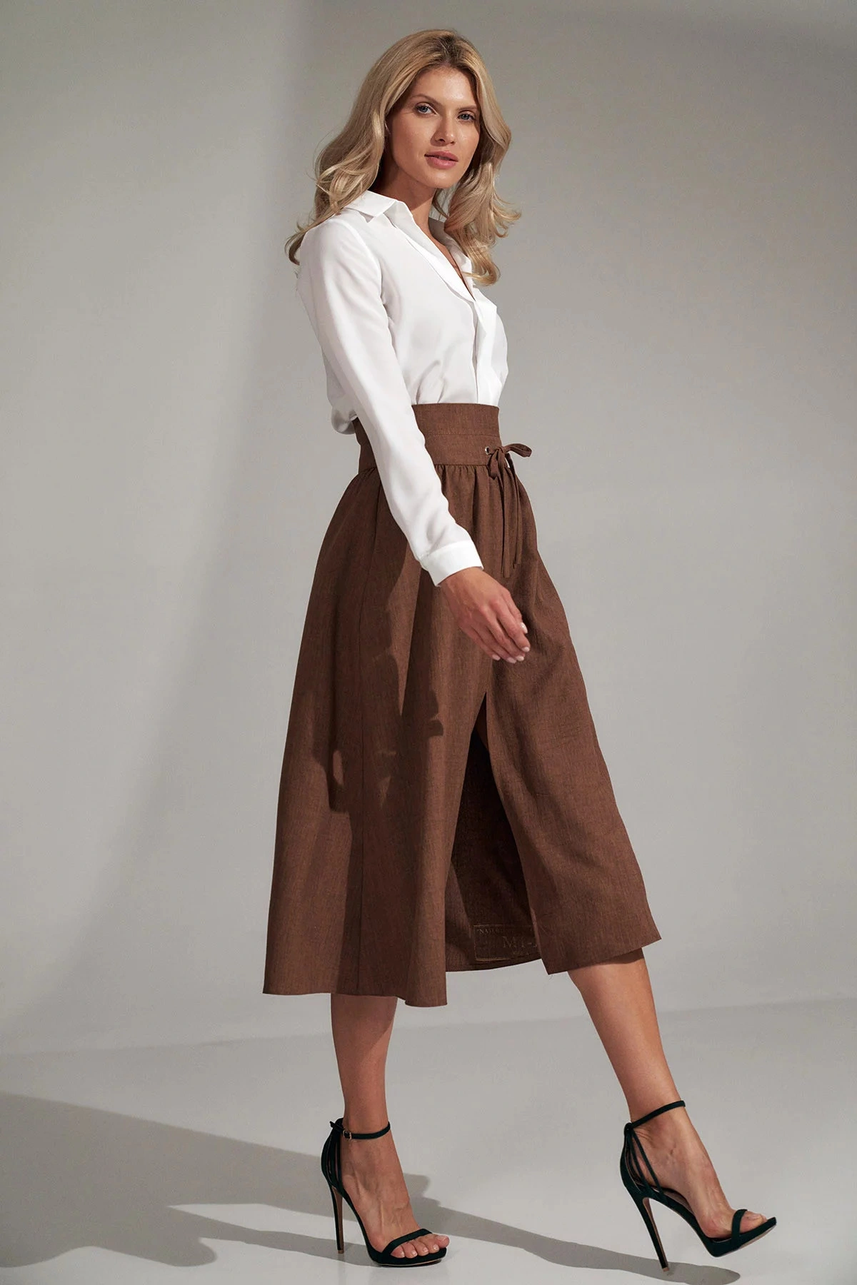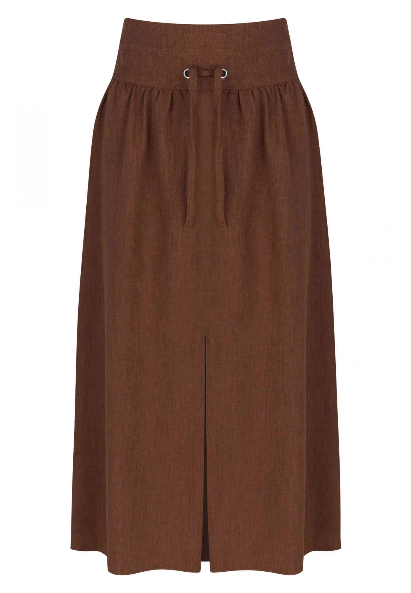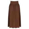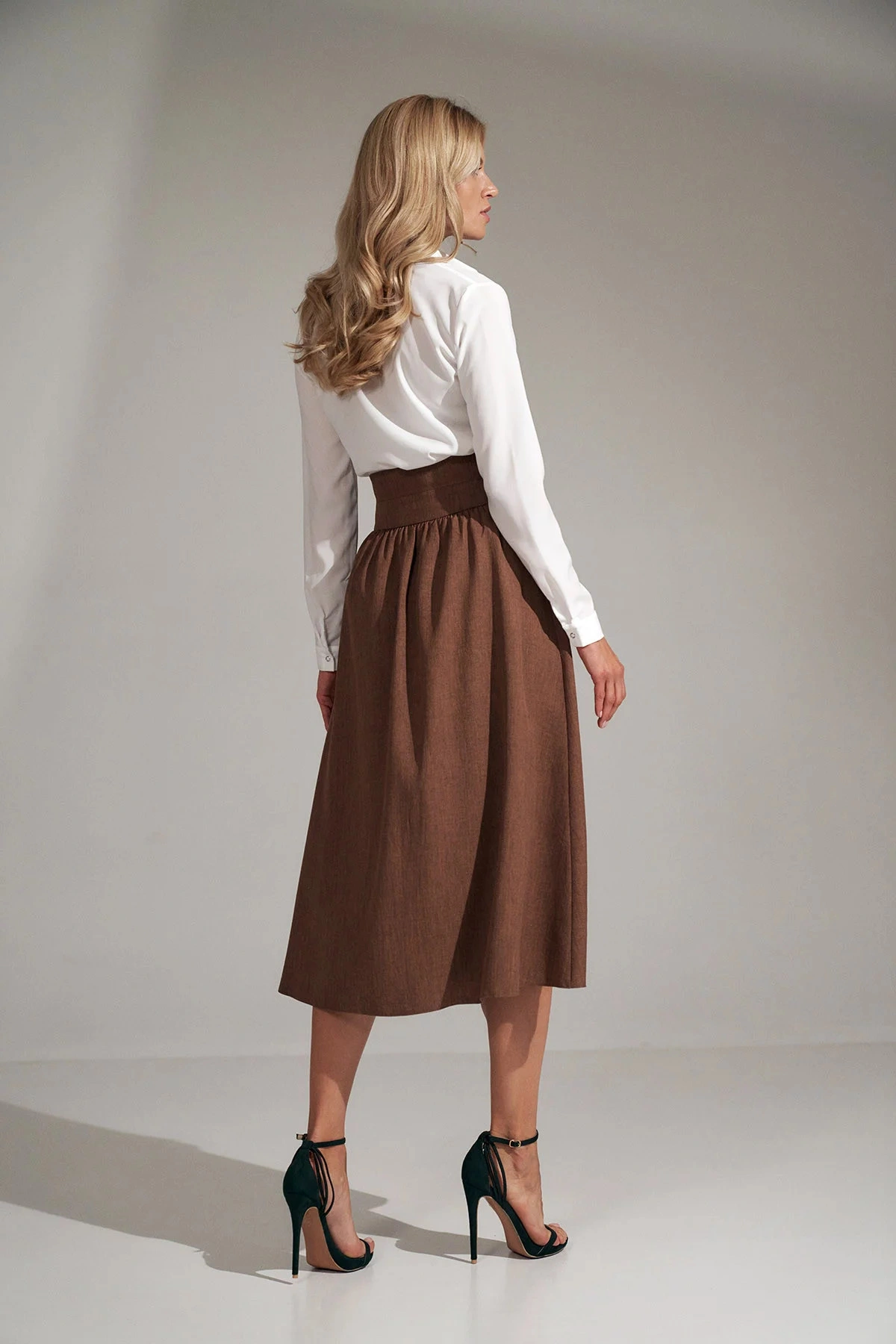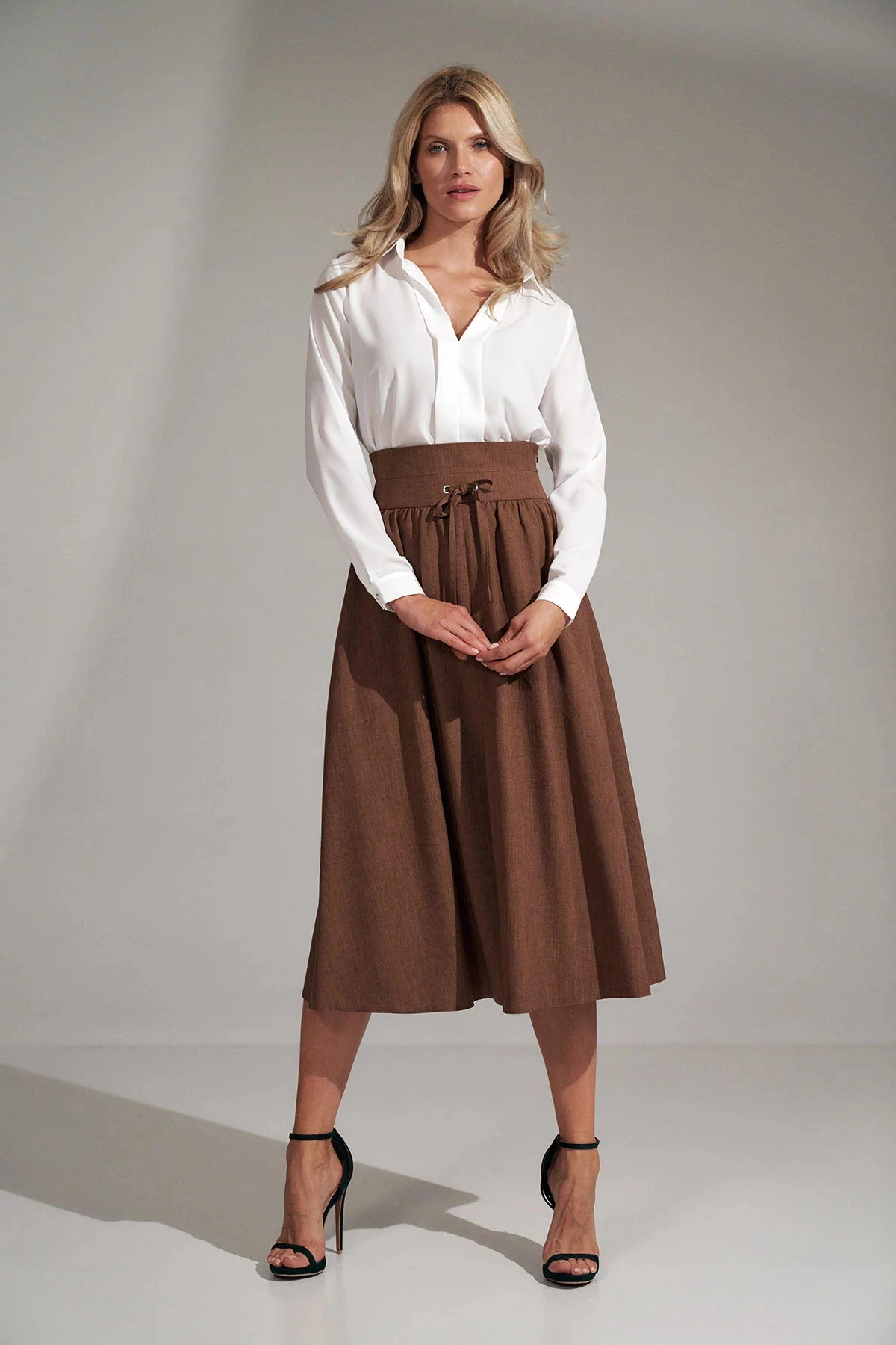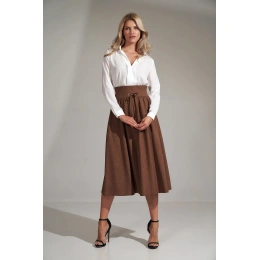 Hnědá dlouhá, rozšířená, nařasená sukně, široký vysoký pás s ozdobným zavazováním, vpředu rozparek, bez kapes, zapínání na levém boku na krytý zip, bez podšívky.