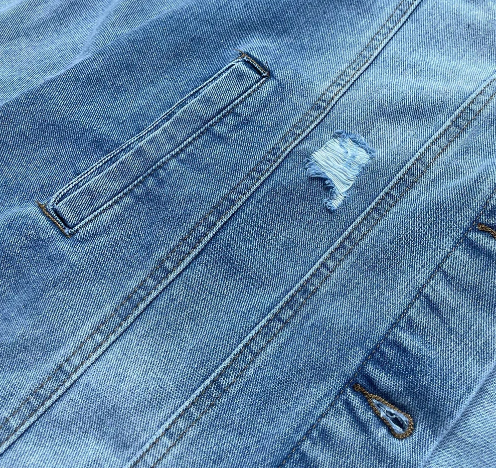 Denimová bunda s protrženími a zesvětlením.