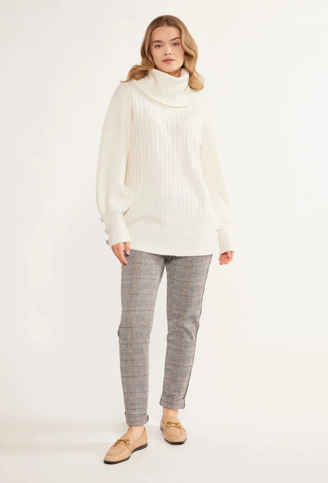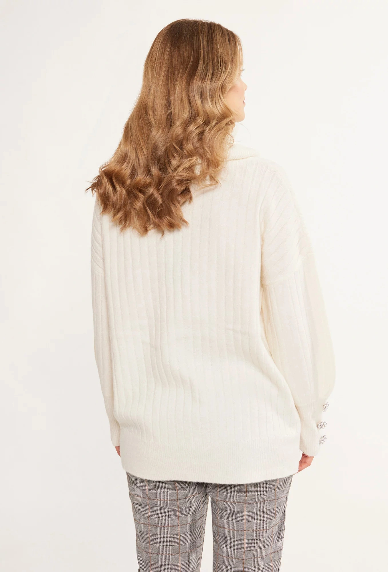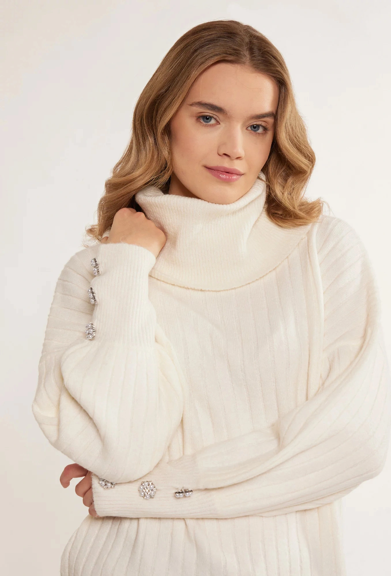 Dámský rolák volného střihu s ozdobným prošitím, vyrobený z materiálu příjemného na dotek. Golf s dlouhými, mírně nadýchanými rukávy s bižuterními knoflíky na koncích. Tento model bude jistě fungovat i v chladném počasí. Modelka na obrázku je 177 cm vysoká a má velikost 36.