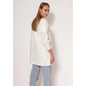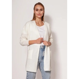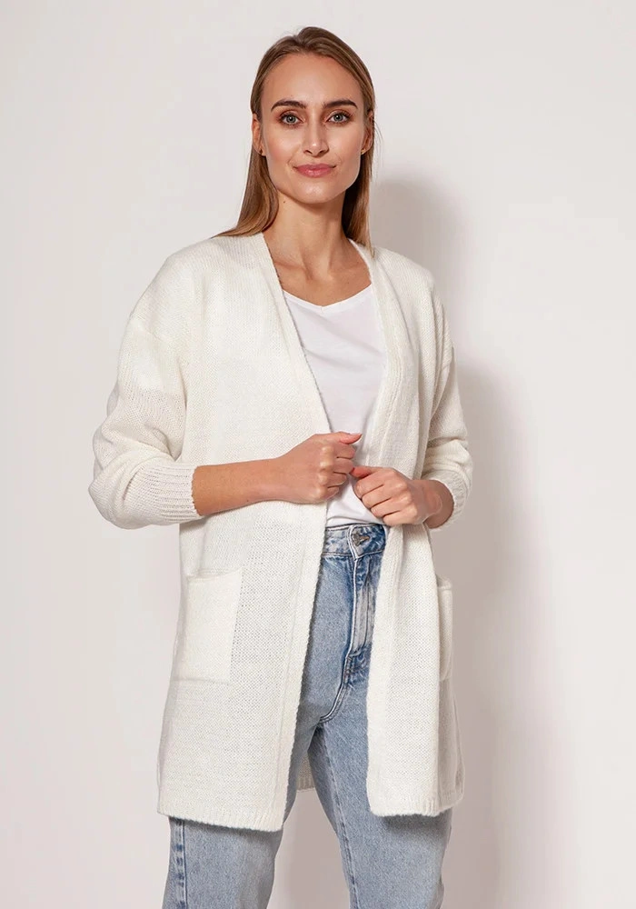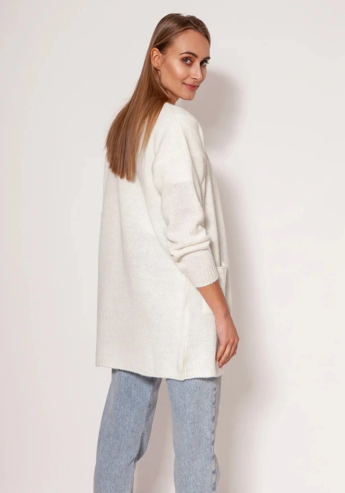 Měkký svetrový kabát z melanžového úpletu. Vyrobeno v polské rodinné manufaktuře. Minimalistický střih s tenkým žebrováním, spadlými rameny a kapsami na bocích.