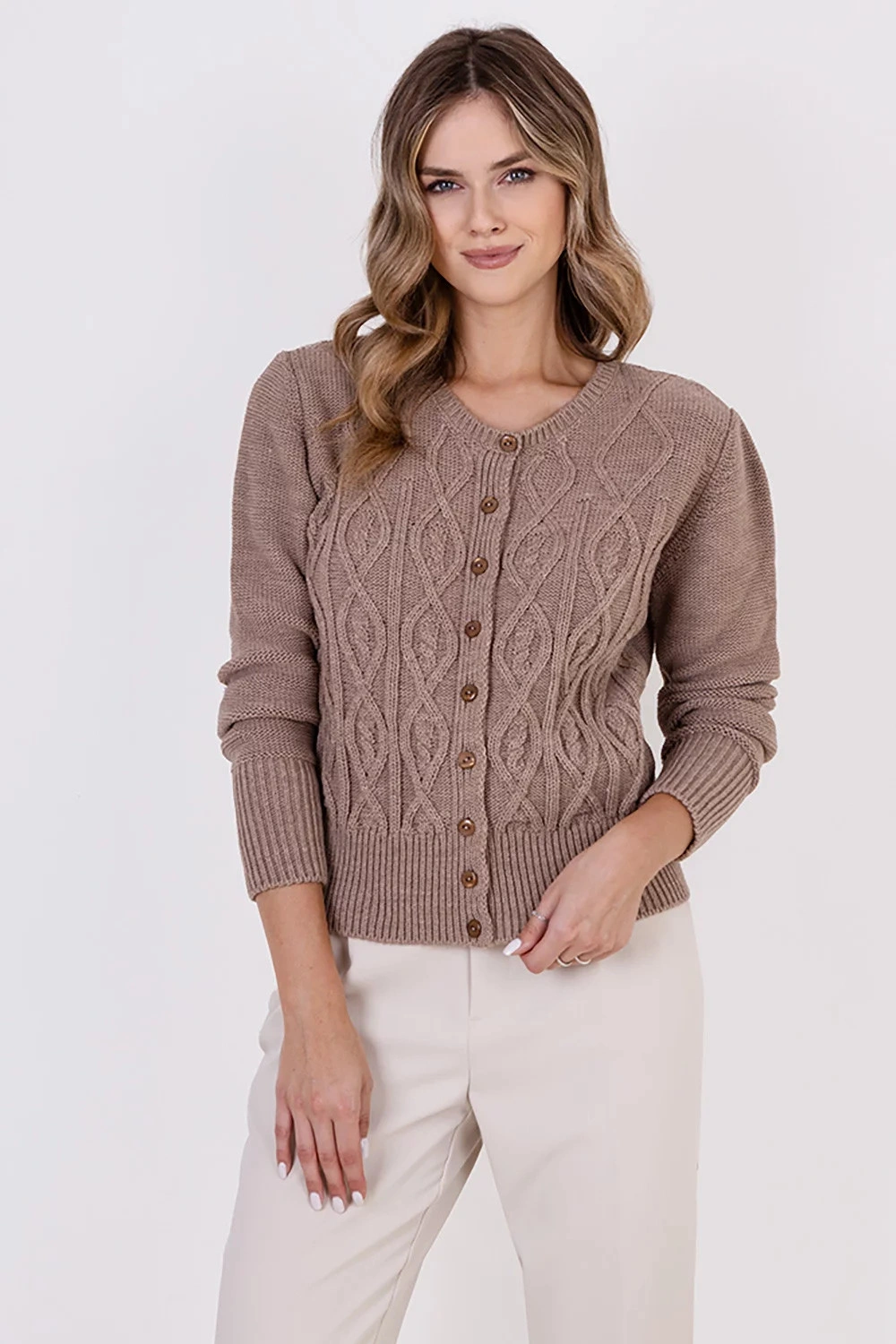 Tento elegantní kardigan v délce do boků je ideální volbou pro běžné i formálnější příležitosti. Svetr má kulatý výstřih, který mu dodává klasický šarm. Žebrované manžety navíc zajišťují dokonalé přizpůsobení. Jedinečné ozdobné vazby dodávají svetru zvláštní nádech.