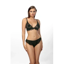 - ušitý z průsvitného materiálu- podprsenka má trojúhelníkové košíčky- nastavitelná, neodepínací ramínka- kalhotky zdobené volánkem- na zadní straně smyslný výkroj