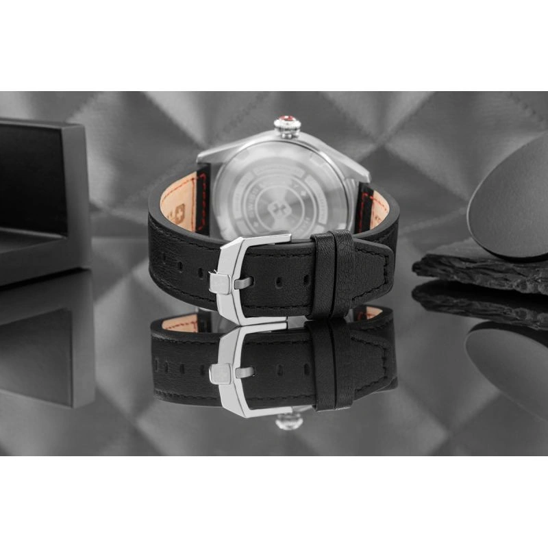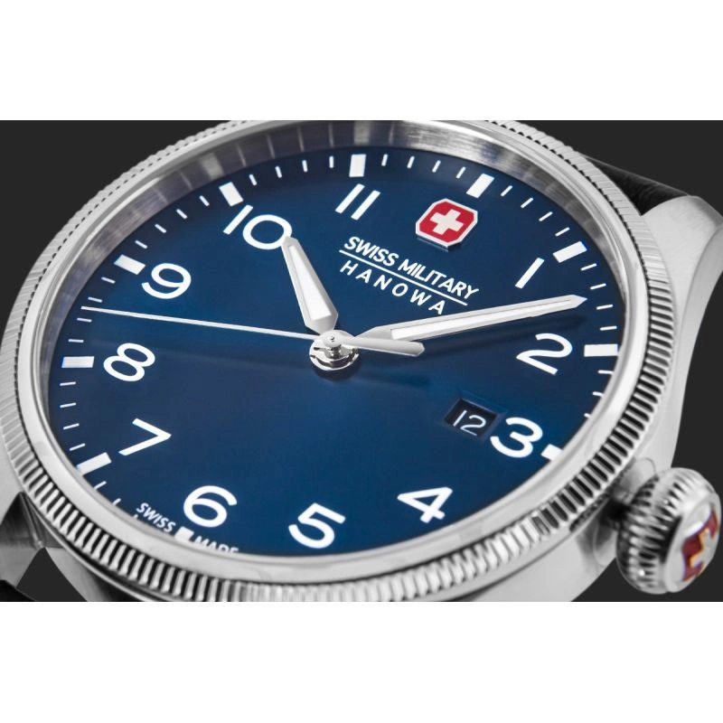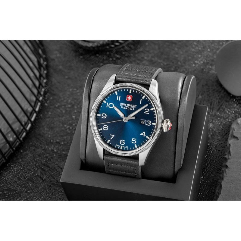 Zegarek SWISS MILITARY HANOWA to szwajcarska precyzja stworzona z myślą o mężczyznach, którzy wiedzą, czego chcą – i nie godzą się na nic mniej niż doskonałość. Mechanizm SWISS Made to nie jest tylko napęd wskazówek – to symbol zegarmistrzowskiej tradycji, która łączy technologię z kunsztem. Wyposażonywmechanizm Ronda 515 Swiss Made oferuje dokładność, której możesz zaufać w każdej sytuacji – od spotkań biznesowych po wyprawy w teren. Szafirowe szkło, mocna koperta i doskonale dopasowany skórzany ze stylową klamrą tworzą konstrukcję na lata - do garnituru, ale i do codziennych wyzwań. Dzięki wodoszczelności na poziomie 10 BAR (ATM) oraz zakręcanemu deklowi, zegarek jest odpowiednio zabezpieczony przed wodą i innymi czynnikami zewnętrznymi, co czyni go niezawodnym towarzyszem także w bardziej wymagających warunkach. Granatowa tarcza przyciąga uwagę elegancką grą światła, która zmienia się w zależności od kąta patrzenia — nadając zegarkowidynamiczn