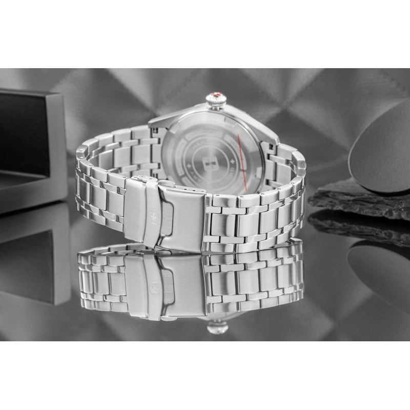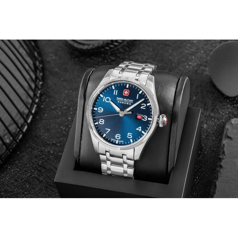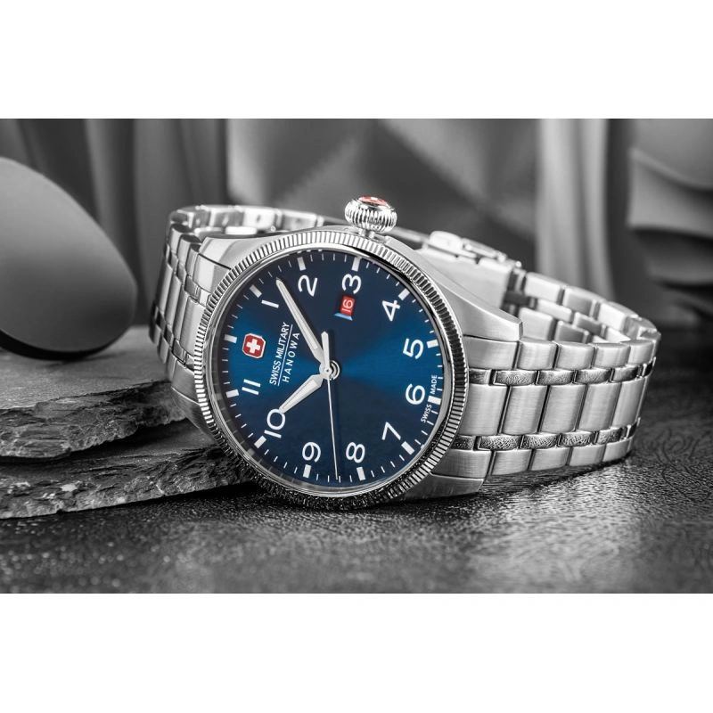 Zegarek SWISS MILITARY HANOWA to szwajcarska precyzja stworzona z myślą o mężczyznach, którzy wiedzą, czego chcą – i nie godzą się na nic mniej niż doskonałość. Mechanizm SWISS Made to nie jest tylko napęd wskazówek – to symbol zegarmistrzowskiej tradycji, która łączy technologię z kunsztem. Wyposażonywmechanizm Ronda 515 Swiss Made oferuje dokładność, której możesz zaufać w każdej sytuacji – od spotkań biznesowych po wyprawy w teren. Szafirowe szkło, mocna koperta i dobrze wyważona stalowa bransoleta z czterostopniowym zapięciem tworzą konstrukcję na lata - do garnituru, ale i do codziennych wyzwań. Dzięki wodoszczelności na poziomie 10 BAR (ATM) oraz zakręcanemu deklowi, zegarek jest odpowiednio zabezpieczony przed wodą i innymi czynnikami zewnętrznymi, co czyni go niezawodnym towarzyszem także w bardziej wymagających warunkach. Granatowa tarcza przyciąga uwagę elegancką grą światła, która zmienia się w zależności od kąta patrzenia — nadając zega