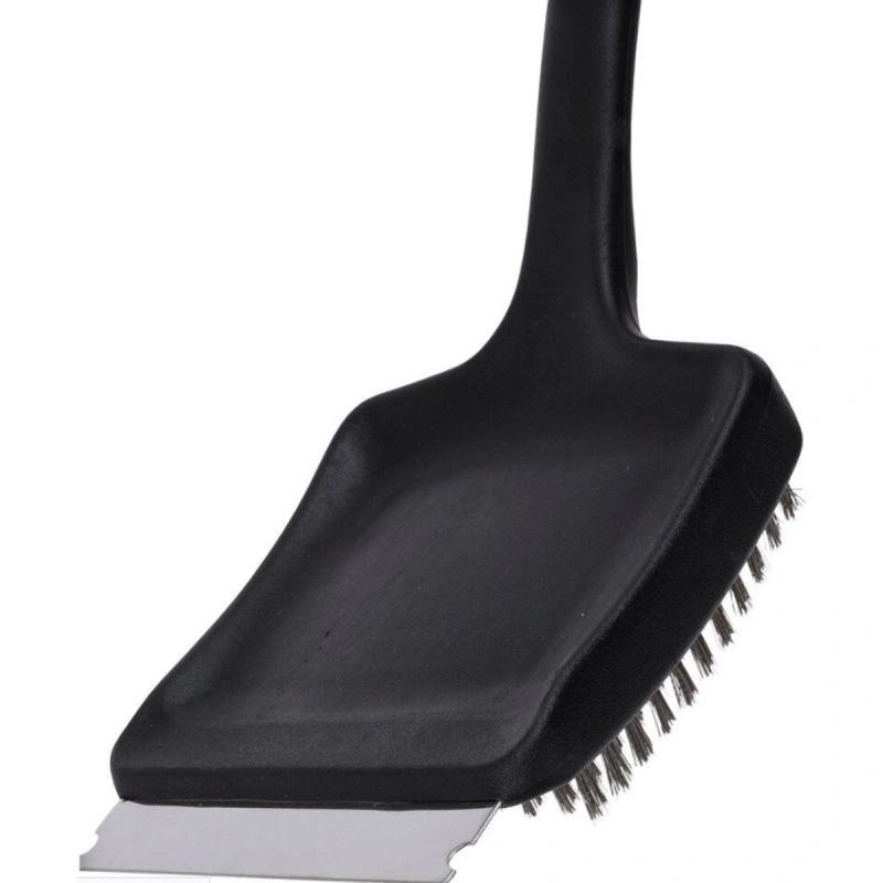 Kovová škrabka na konci kartáče umožňuje odstranit obzvláště odolné, připálené nečistoty, se kterými si samotné štětiny nemusí poradit. Díky její ostré hraně můžete účinně seškrábat zaschlou mastnotu a zbytky jídla, aniž byste poškodili gril. Jedná se o praktický doplněk kartáče, který výrazně zvyšuje jeho funkčnost a urychluje čištění grilu.