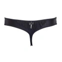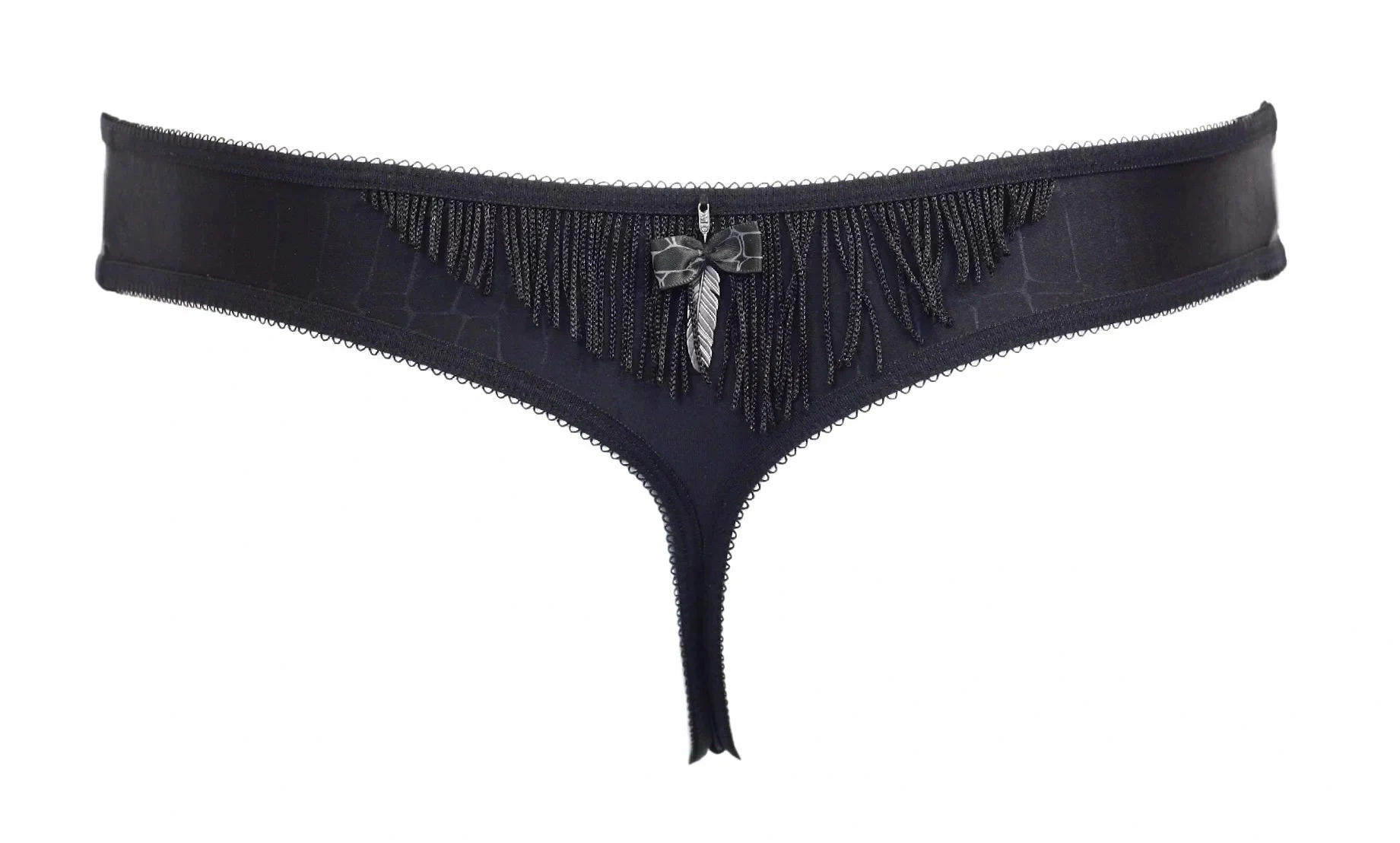 Krásné tanga Marlies Dekkers. Hladký povrch s vypalovaným vzorem ozdoba střapečky v přední i zadní části kalhotek. Nádherné stříbrné peříčko umístěné na zadním díle kalhotek.