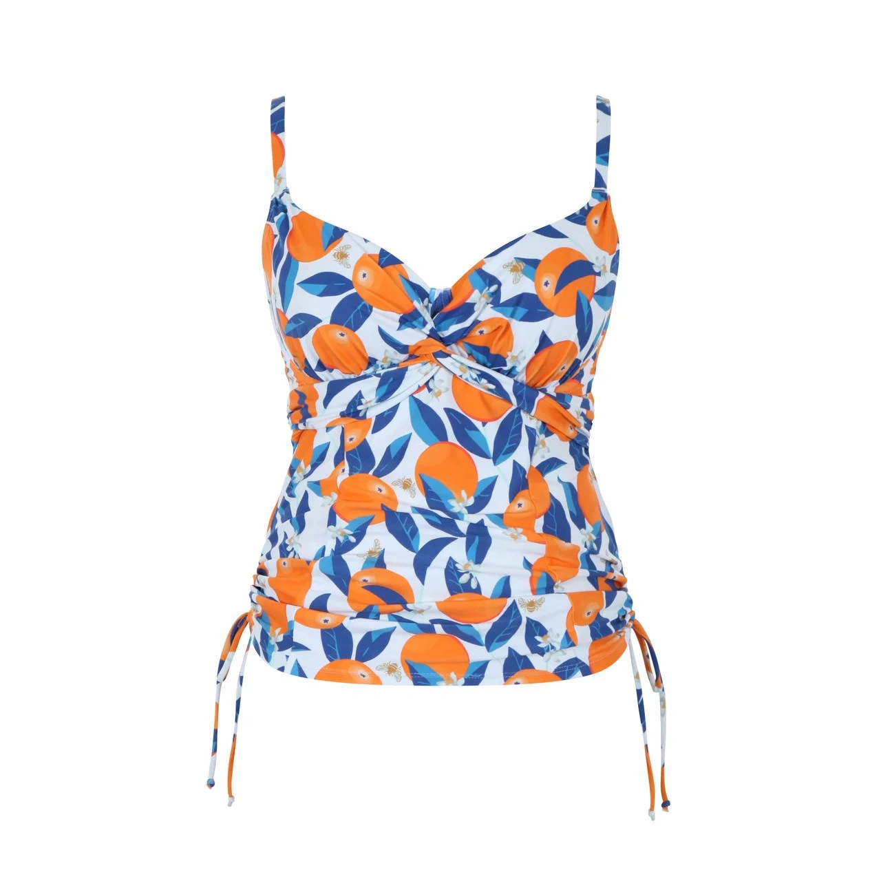 Zažijte esenci italského léta s naší nejnovější kolekcí plavek Sicily. Inspirována zářivými pomerančovými háji rozesetými po celé Sicílii, tato řada vyzařuje jemnou vůni pomerančových květů, osvěžující chuť čerstvě vymačkané šťávy a teplé, zlatavé odstíny západu slunce. Ať už se povalujete u bazénu, objevujete skryté zátoky nebo si užíváte piknik na pláži při západu slunce, tato kolekce je navržena tak, aby vám dodala sílu a inspiraci. Eva Balcony Tankini mají vpředu uprostřed prokládaný detail, který vytváří lichotivý tvar a zakrývá dráty. Tento styl poskytuje více zakrývající variantu s nastavitelnými bočními vázáními. Pojďme tedy společně přijmout radost z léta s plavkami, které jsou stejně živé a jedinečné jako vy!