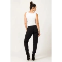 Tepláky z pletené teplákoviny v tmavě šedé barvě, dole zakončené širokým žebrováním, které je široké asi 10 cm. Velmi módní a pohodlné.