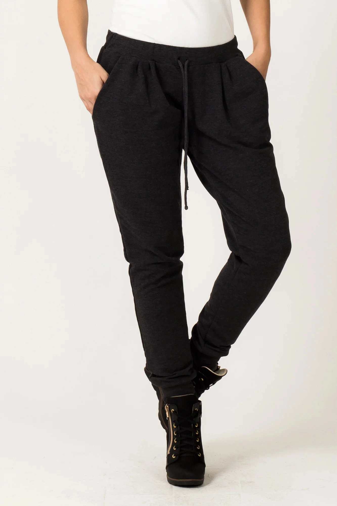 Tepláky z pletené teplákoviny v tmavě šedé barvě, dole zakončené širokým žebrováním, které je široké asi 10 cm. Velmi módní a pohodlné.