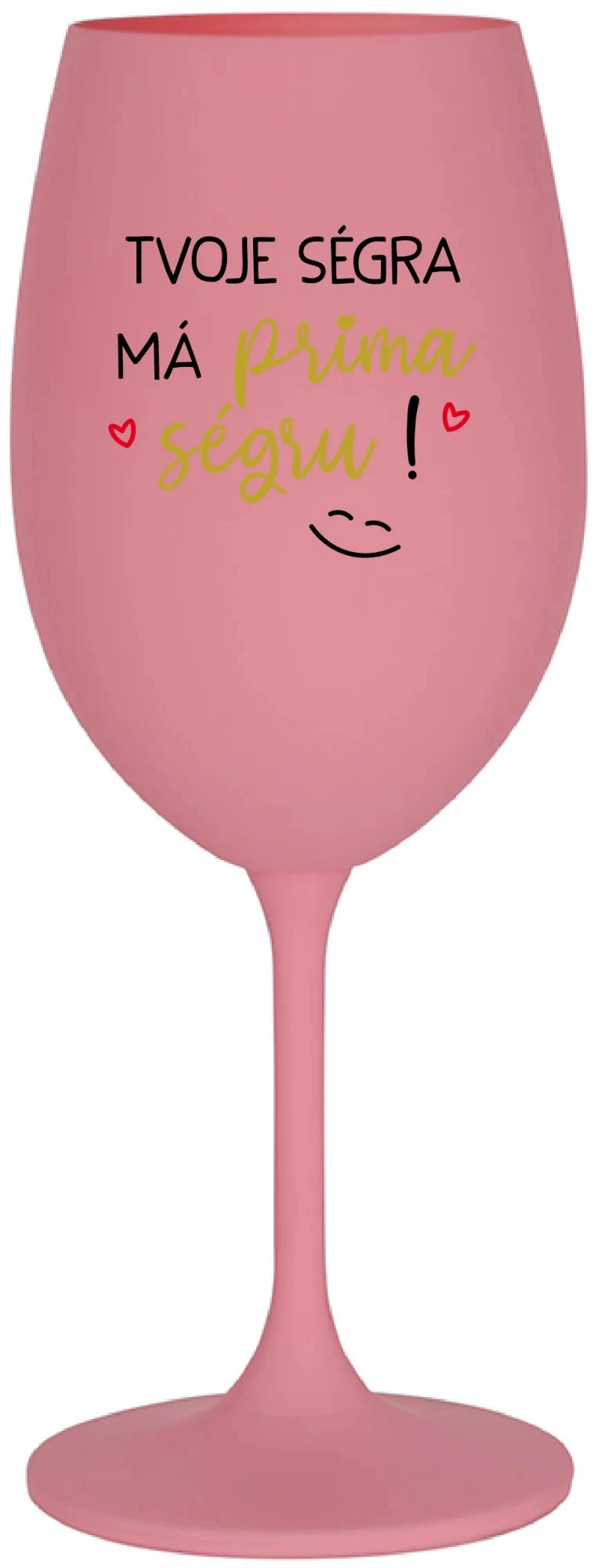 Vinná růžová sklenice s originálním motivem TVOJE SÉGRA MÁ PRIMA SÉGRU! je krásným a osobitým dárkem, které ale využijete i Vy sami třeba ve chvílích, kdy si budete chtít zpříjemnit náročný den. Tyto originální vinné sklenice jsou totiž nejen pro výjimečné události, ale i pro běžné večery, které si chcete zpříjemnit sklenkou dobrého vína. Jistě proto potěší každého milovníka vína, i toho, kdo si umí svůj život vychutnat plnými doušky.