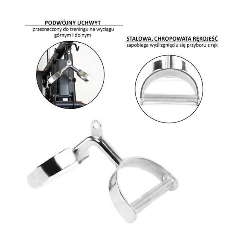 UW08 HMS je dvojitá rukojeť určená pro trénink horního a dolního zdvihu. Používá se především pro procvičování zádových svalů. Její tvar umožňuje širší rozsah pohybu než u rovného nebo úzkého úchopu. Umožňuje také silnější svalové napětí, díky čemuž je náš trénink efektivnější.