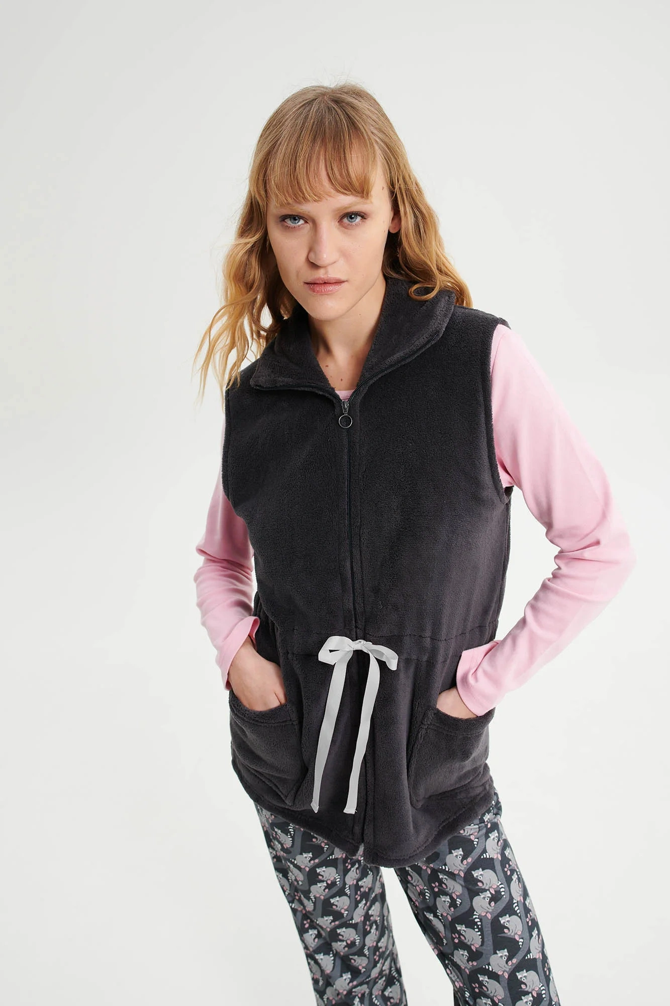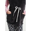 Dámská vesta na zip, s límcem a nastavitelným páskem je vyrobena z tkaniny příjemné na dotek, která poskytne pohodlí a pocit elegance pro chvíle strávené doma.