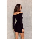 Jedinečné mini šaty, které jistě upoutají pozornost při každé příležitosti. Šaty s širokým výstřihem přecházejícím do odhalených ramen s dlouhými rukávy. Šaty s ozdobným řasením po celé délce předního dílu a částečně na zádech. Šaty jsou vyrobeny z látky se třpytkami. Tento model šatů je výbornou volbou jako kompletní oblečení, které se skvěle hodí na různé oslavy. Výrobek je vyroben a ušit v Polsku.