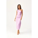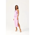Midi šaty na jedno rameno s jemným rozparkem na nohavicích jsou vyrobeny z jemné saténové tkaniny. Na boku je řasení, které dokonale zakryje případné nedokonalosti. Široké ramínko s řasením na jednom rameni jim dodává jedinečný charakter. Zapínají se na krytý zip na boku šatů. Tyto midi šaty jsou nejen elegantní, ale také funkční. Midi délka dodává šatům rafinovaný, ženský styl. Tento střih šatů vám umožní cítit se originálně tím, že zdůrazní váš osobitý styl, a jistě upoutá pozornost tím, že vás odliší z davu, ať už se jedná o jakoukoli příležitost. Výrobek je vyroben a ušit v Polsku.