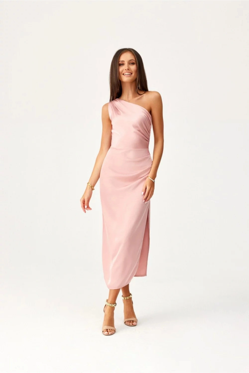 Midi šaty na jedno rameno s jemným rozparkem na nohavicích jsou vyrobeny z jemné saténové tkaniny. Na boku je řasení, které dokonale zakryje případné nedokonalosti. Široké ramínko s řasením na jednom rameni jim dodává jedinečný charakter. Zapínají se na krytý zip na boku šatů. Tyto midi šaty jsou nejen elegantní, ale také funkční. Midi délka dodává šatům rafinovaný, ženský styl. Tento střih šatů vám umožní cítit se originálně tím, že zdůrazní váš osobitý styl, a jistě upoutá pozornost tím, že vás odliší z davu, ať už se jedná o jakoukoli příležitost. Výrobek je vyroben a ušit v Polsku.