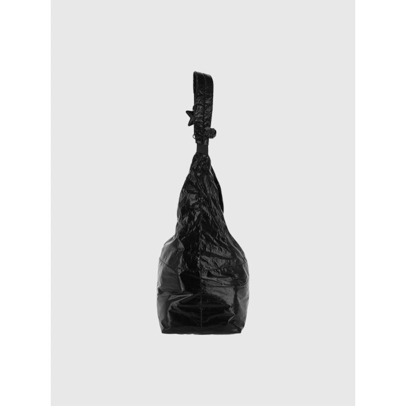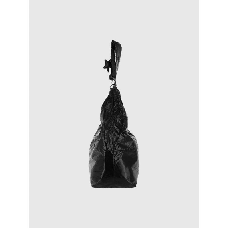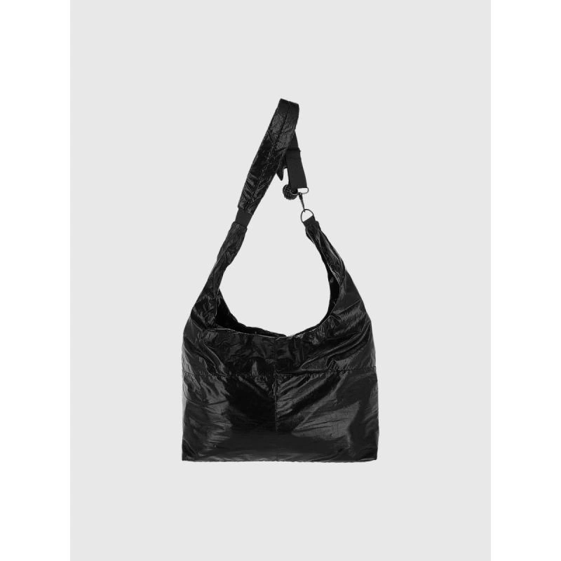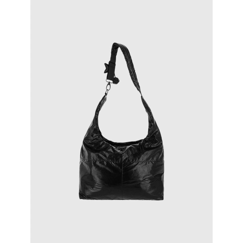 tato černá taška přes rameno je ideální volbou pro ženy, které si cení jednoduchosti, funkčnosti a odvážného designu. Díky lesklému provedení a minimalistickému tvaru s futuristickým nádechem se model skvěle hodí k modernímu městskému stylu. Taška je lehká, prostorná a pohodlná - hodí se pro každodenní použití i cestování. Je vyrobena z odolného syntetického materiálu, nabízí velkou hlavní přihrádku na zip a praktické vnitřní kapsy. Vodoodpudivá impregnace chrání materiál před vlhkostí a nastavitelný popruh umožňuje tašku nosit různými způsoby. Ozdobný kroužek na klíče ve tvaru hvězdy podtrhuje její jedinečný charakter.