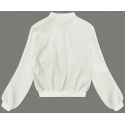 Bunda má volný střih, má stojáček, dvě kapsy bez zapínání a zapíná se patentkami. Model nemá podšívku. Délka bundy sahá k bokům.