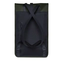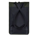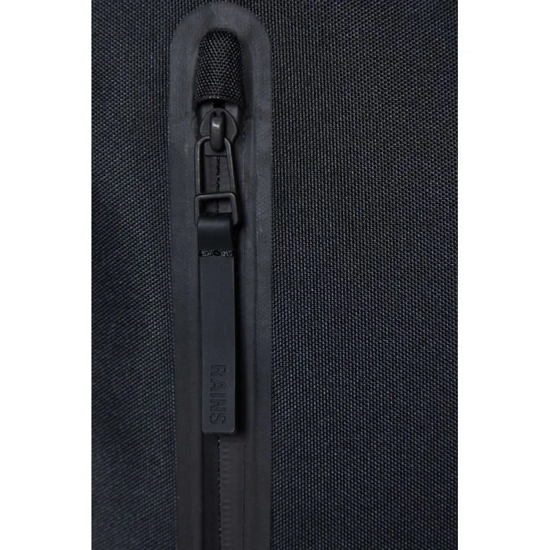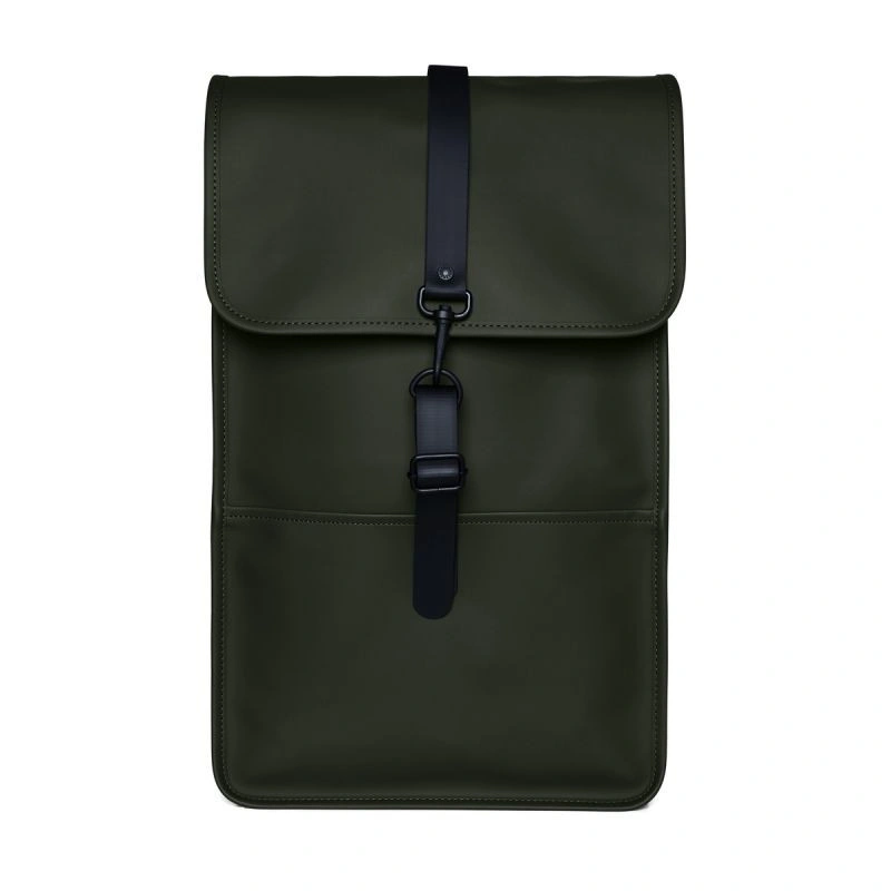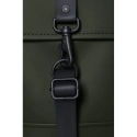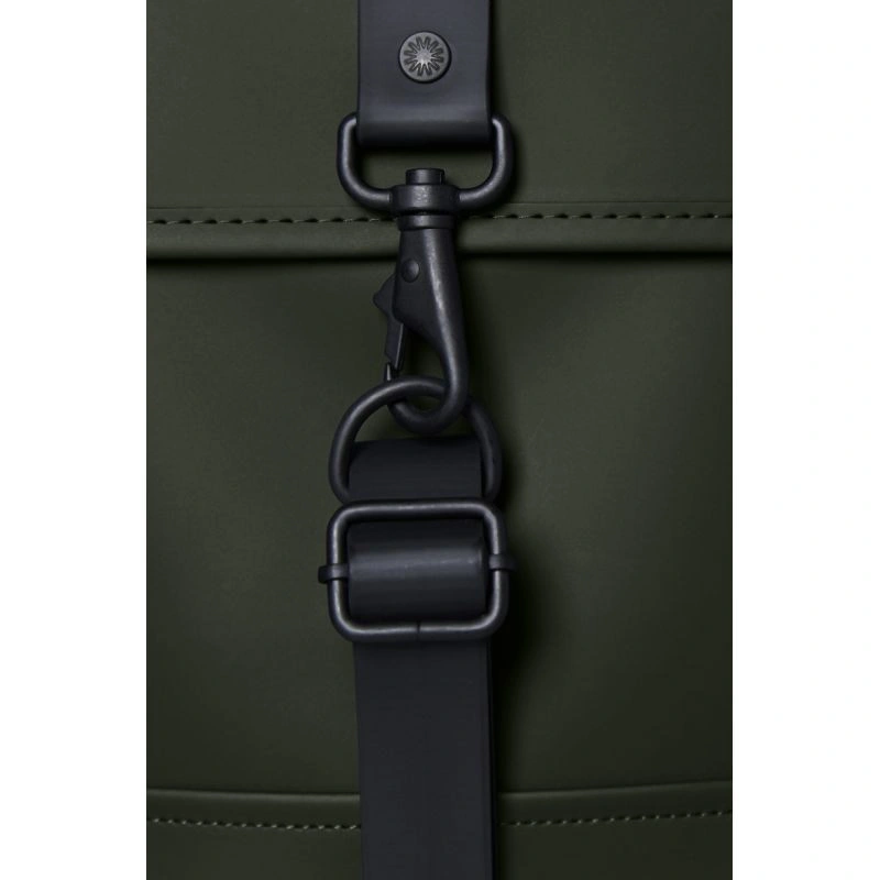 Silueta batohu je klasikou značky Rains, má výraznou klopu a centrální popruh se zapínáním na karabinu.