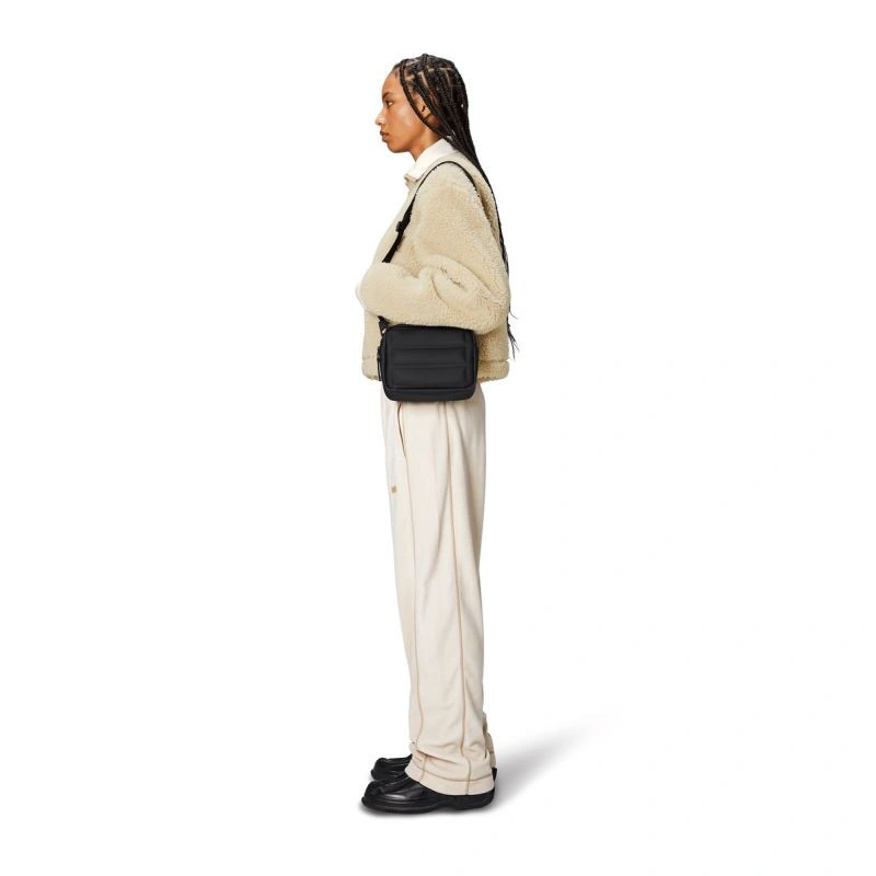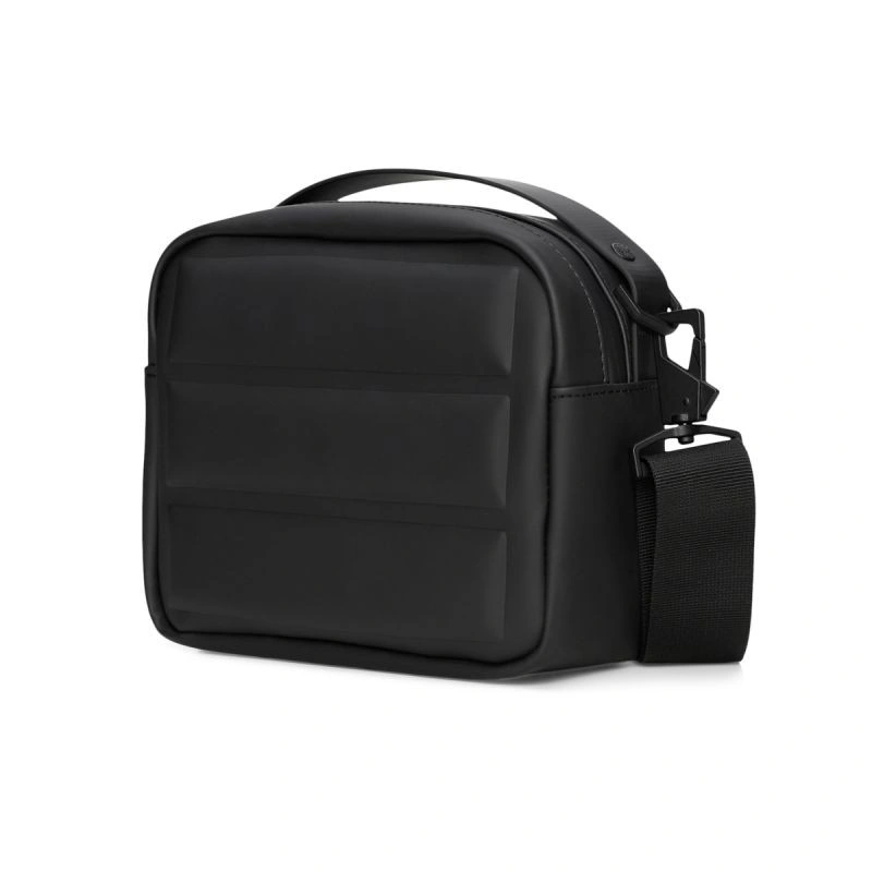 Taška Shield Box Bag je interpretací ikonické tašky Box Bag od společnosti Rains s panely na přední a zadní straně, které vytvářejí iluzi puchýřů. Design je zakončen pevným horním uchem a nastavitelným popruhem, připevněným pomocí karabin.