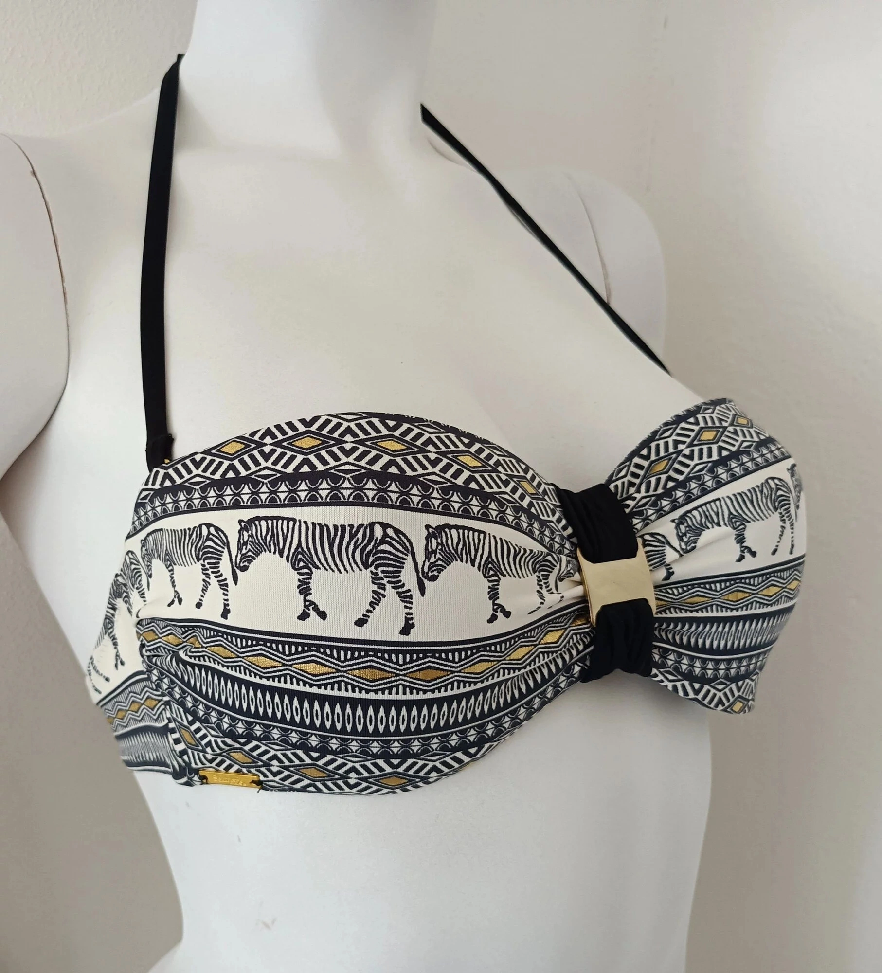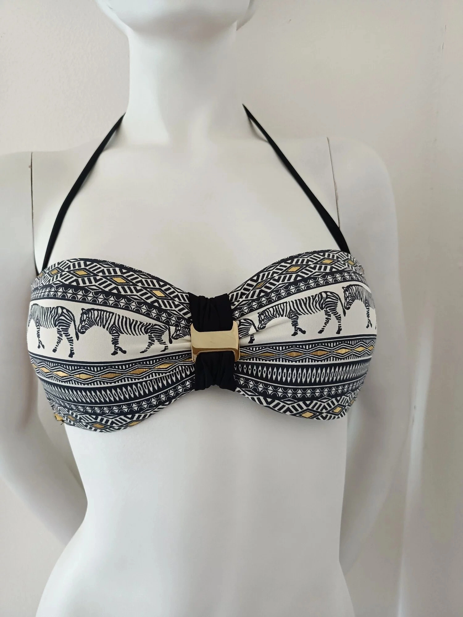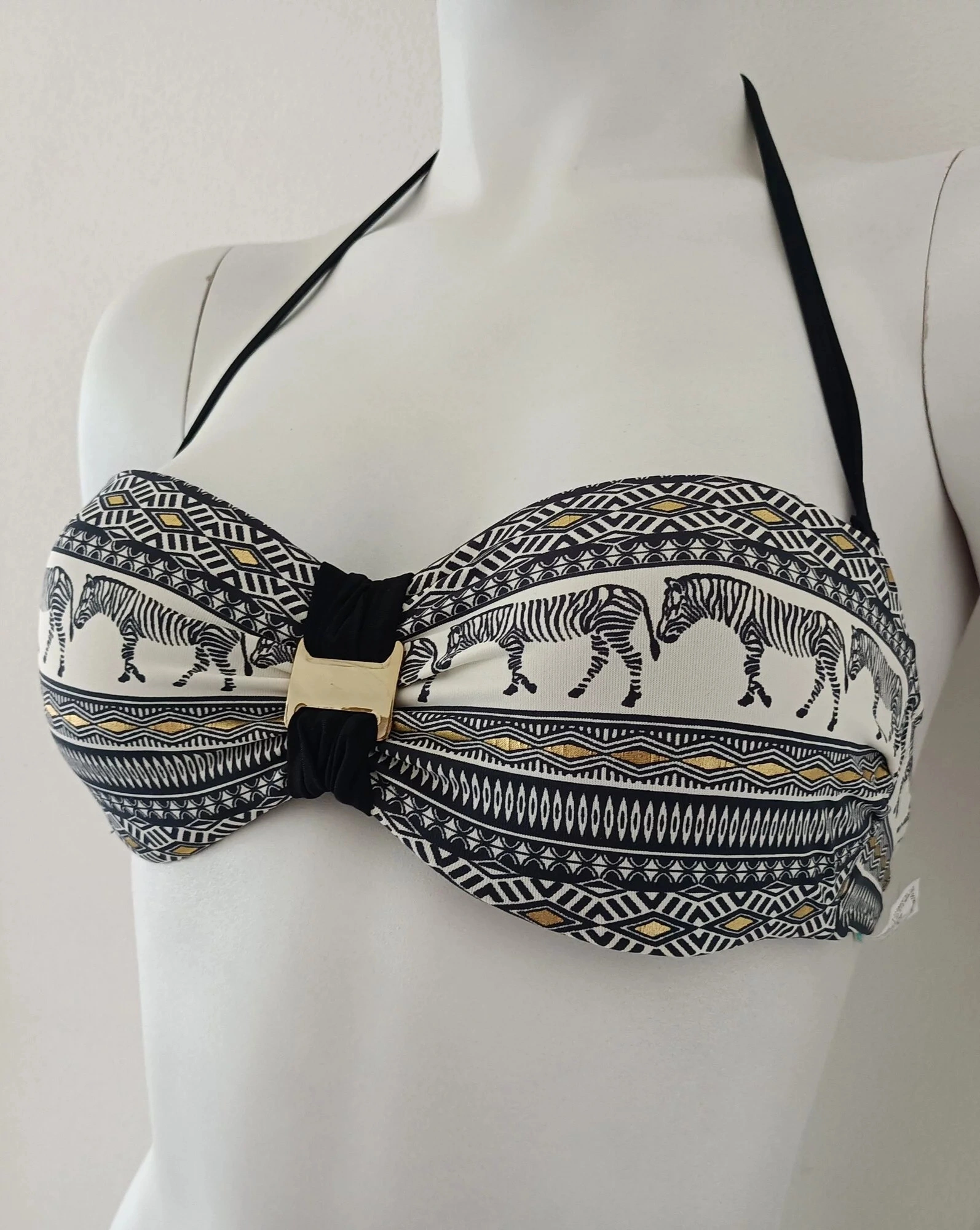 Dámský vrchní díl plavek s potiskem zebry a zlatými prvky.